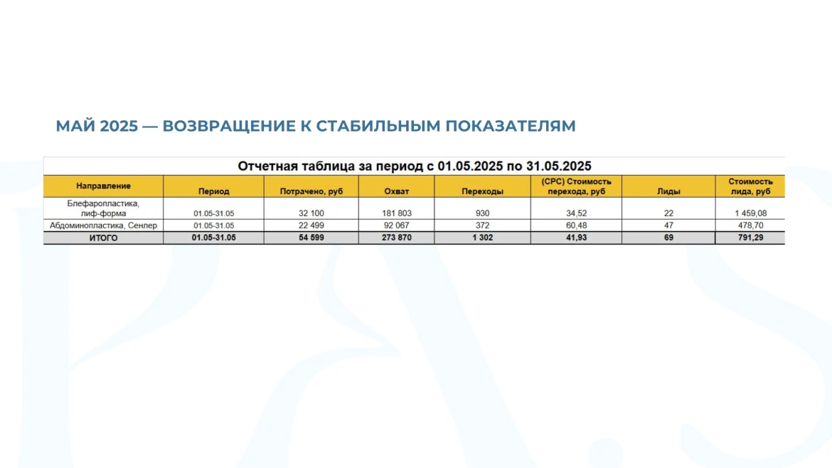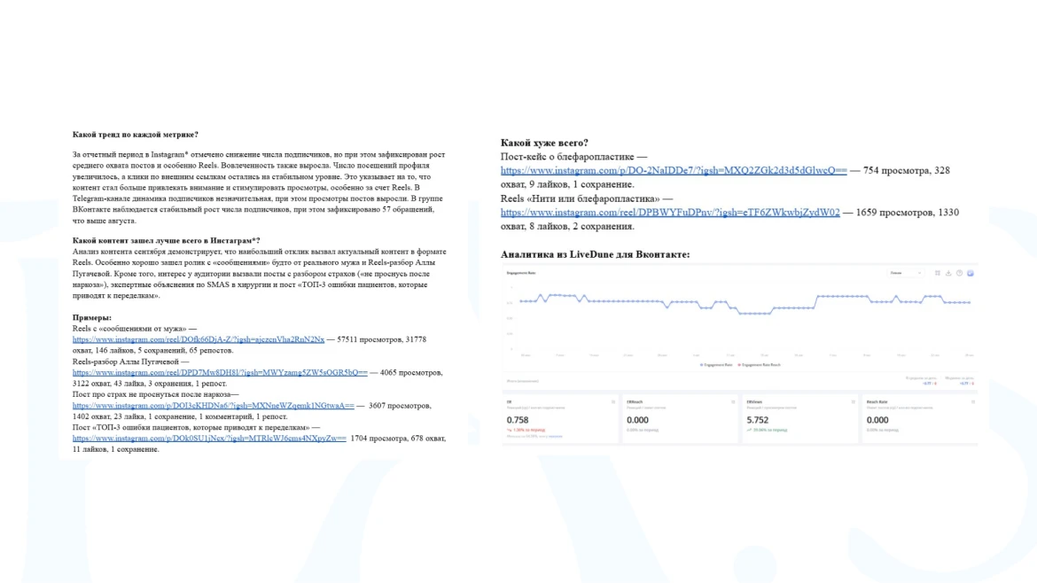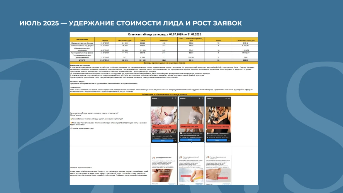 Мы регулярно публикуем посты, которые посвящены реальным страхам пациентов: «А вдруг я не проснусь после наркоза?», «Сколько держится эффект SMAS-лифтинга?», «Когда можно делать абдоминопластику после родов?» Периодически подходим даже к экспертным темам креативно, вводя форматы вовлечения (чек-листы, например). Каждый материал помогает пациенту принять решение спокойно и осознанно. Регина Александровна — лицо бренда. Мы снимаем Reels, где она говорит на камеру, разбирает разные проблемы, с которыми сталкиваются потенциальные и реальные пациенты... Это делает аккаунт живым и конкурентоспособным на фоне хирургов, которые часто прячутся за безликими фото «до/после». Все съёмочные и контентные материалы мы готовим заранее, также берём на себя взаимодействие с видеооператором. Это позволяет клиенту сосредоточиться на своей профессиональной деятельности, не отвлекаясь на организационные задачи, и сохранять стабильные результаты и активность в социальных сетях. Проводили интерактивы в сторис: «Угадай, какую операцию сделала эта звезда», опросы, тесты о мифах в пластике, бьюти-викторины. Они вовлекают, снимают барьеры, помогают аудитории общаться с хирургом без страха. Показатели на наших рилс с разборами: Не просто вставляем фото до и после операции, а добавляем истории пациентов, описываем их трудности, говорим о результатах. Например: «Я перестала стесняться себя перед мужем» — такой формат работает лучше. Мы ушли от публикации только примеров работ и сделали ставку на смысл, эмоции и личное присутствие врача. В нише пластической хирургии 80% контента — шаблонное «до/после» без комментариев, и такой человеческий взгляд, как в нашем проекте, встречается реже. Во ВКонтакте мы полностью дублируем контент из *Нельзяграма. Несмотря на отсутствие отдельной контентной стратегии, страница показывает хорошие показатели вовлечённости. Согласно данным LiveDune, ER вырос более чем на 80% за период нашей работы, а среднее количество реакций на публикации и просмотры стабильно растет в течение года. Эта площадка остаётся дополнительным каналом видимости и точкой входа для пациентов, которые предпочитают российские социальные сети. Даже при полном кросспостинге посты в ВК помогают поддерживать доверие и узнаваемость бренда хирурга, обеспечивая устойчивое присутствие во всех ключевых каналах. Да, контент Telegram-канала дублируется из *Нельзяграма и ВК. Несмотря на то, что рост канала идёт медленно, заявки периодически приходят прямо из комментариев под постами — особенно после публикации кейсов и экспертных материалов. Аудитория Telegram реагирует вовлечённо, но избирательно. Посты с личными размышлениями хирурга и «разборами звёзд» вызывают наибольший отклик. За год мы прошли несколько этапов — от тестовых запусков до выстроенной системы. Главной задачей было не просто привлечь трафик, а добиться прогнозируемости: чтобы каждая заявка стоила адекватных денег, а кампания могла масштабироваться без потери качества. Как видоизменялась работа за год, можно увидеть в таблице: Ежемесячно мы контролировали все показатели таргетированный рекламы хирурга. Ниже — фрагменты отчетов, которые клиент получает каждый месяц. В них отражены ключевые показатели кампаний, выводы по гипотезам, планы на следующий период и отчёт по каждой рекламной кампании. Эт