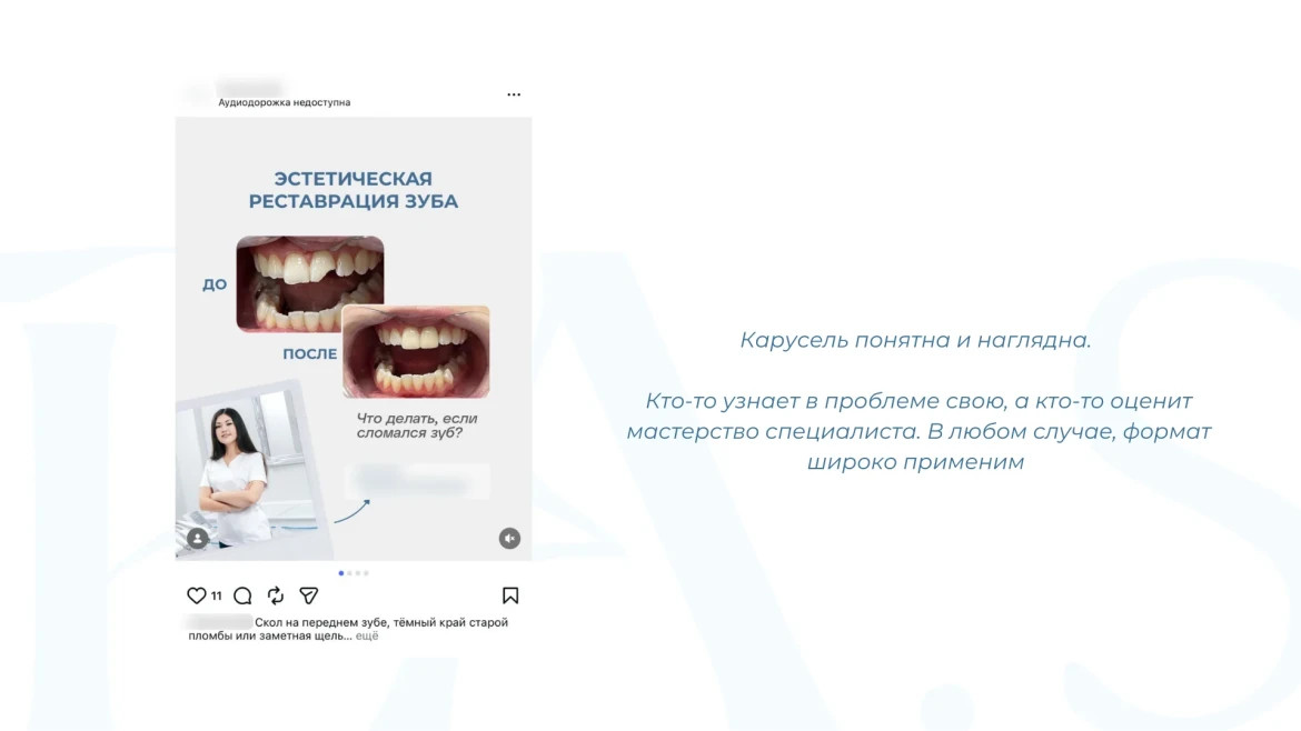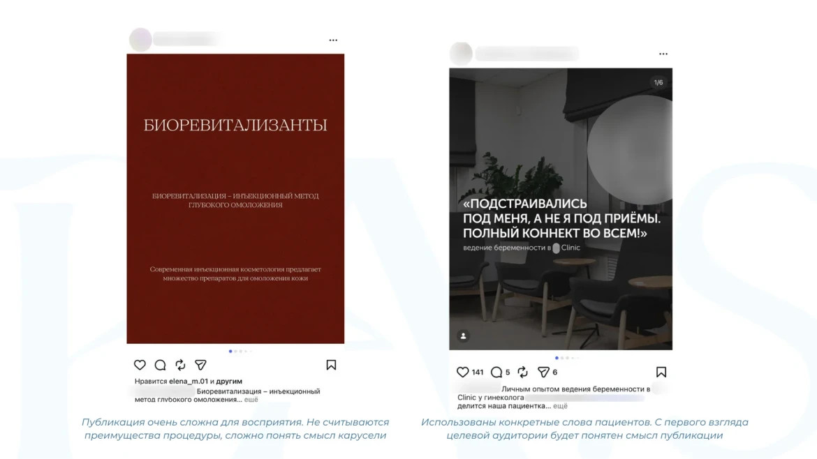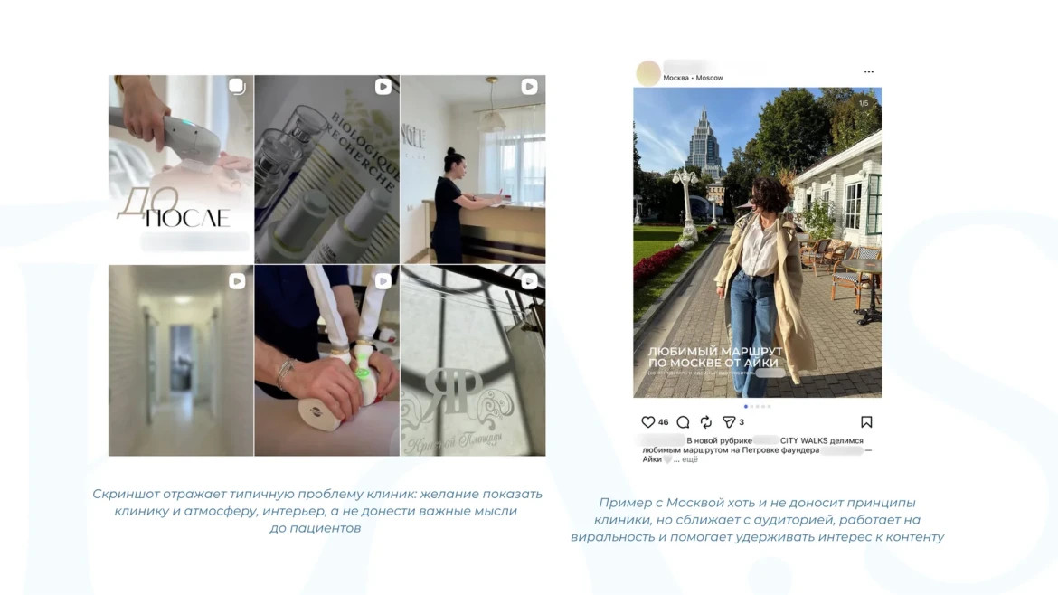Да, возможно аудитории будет сложновато понять, о каких проблемах и способах решения вы говорите. Но это замотивирует ее пойти погуглить — и, конечно, стать на шаг ближе к улучшению здоровья. ➌ Игнорирование инфоповодов Говорить о том, что у всех на слуху — задача новостных каналов или пабликов, а клинике не стоит тратить на это единицы контента. Иначе есть риск того, что аудитория поймет, что за аккаунтом клиники спрятаны такие же люди, как они сами: те, кто интересуется повесткой дня и хочет обсуждать то, что беспокоит многих. Вместо этого попробуйте в очередной раз показать интерьер вашей клиники, чтобы все могли почувствовать атмосферу. Запутали мы вас? На самом деле уже сами устали быть, как вредитель Гринч, поэтому исправляемся. Что делать, если вы узнали себя в пунктах выше, ваш контент — это сплошной поток полезной информации, и при этом результаты в виде хорошей статистики или обращений отсутствуют? ➊ Если решились на обновления, не удаляйте ранее опубликованный контент Все материалы — это история аккаунта и уже затраченное вами время, не нужно это обесценивать. Кроме того, последний пост в «старом» формате может стать для вас точкой А. С помощью статистики прошлых публикаций вы сможете очень наглядно фиксировать изменения показателей. ➋ Внедрите внутреннюю систему для получения актуальной информации Самое ценное, что могут дать контенту специалисты — это их личный опыт и видение. Назначьте ответственного сотрудника, который будет еженедельно собирать от специалистов интересные случаи и реализованные кейсы. Знаем и понимаем, что именно от врачей добиться этого сложно — поэтому внутри клиники должен быть человек, который напоминал бы коллегам о задаче. ➌ Используйте проверенные инструменты, чтобы переосмыслить подход в ведении социальных сетей Проведите исследование в формате интервью для ваших пациентов: так вы сможете понять, за что и почему выбирают именно вас — и наоборот, почему люди не возвращаются после первого визита. Эти инсайты вы сможете забрать как глобально в маркетинг, так и использовать в контенте, чтобы правильно закрывать возражения вашей ЦА. Рекомендуем провести аудит в двух форматах: Большинство ошибок, которые мы разобрали выше, возникают из-за того, что клиника слишком вовлечена в гонку за контентом. Нет времени остановиться и посмотреть со стороны: эффективны ли сейчас такие решения? Понимают ли вас пациенты? Хочется ли им возвращаться в ваш аккаунт? Мы уже более 8 лет работаем с медицинскими проектами и регулярно видим одни и те же сценарии: хороший, аккуратный, «правильный» контент — но роста, вовлеченности и обращений при этом нет. Но как только появляется структура, фокус на пациента и ясная логика контента, соцсети начинают окупаться и выполнять свою задачу — прогревать пациентов и выстраивать с ними отношения на качественно ином уровне. Мы всегда готовы разобрать ваш случай!