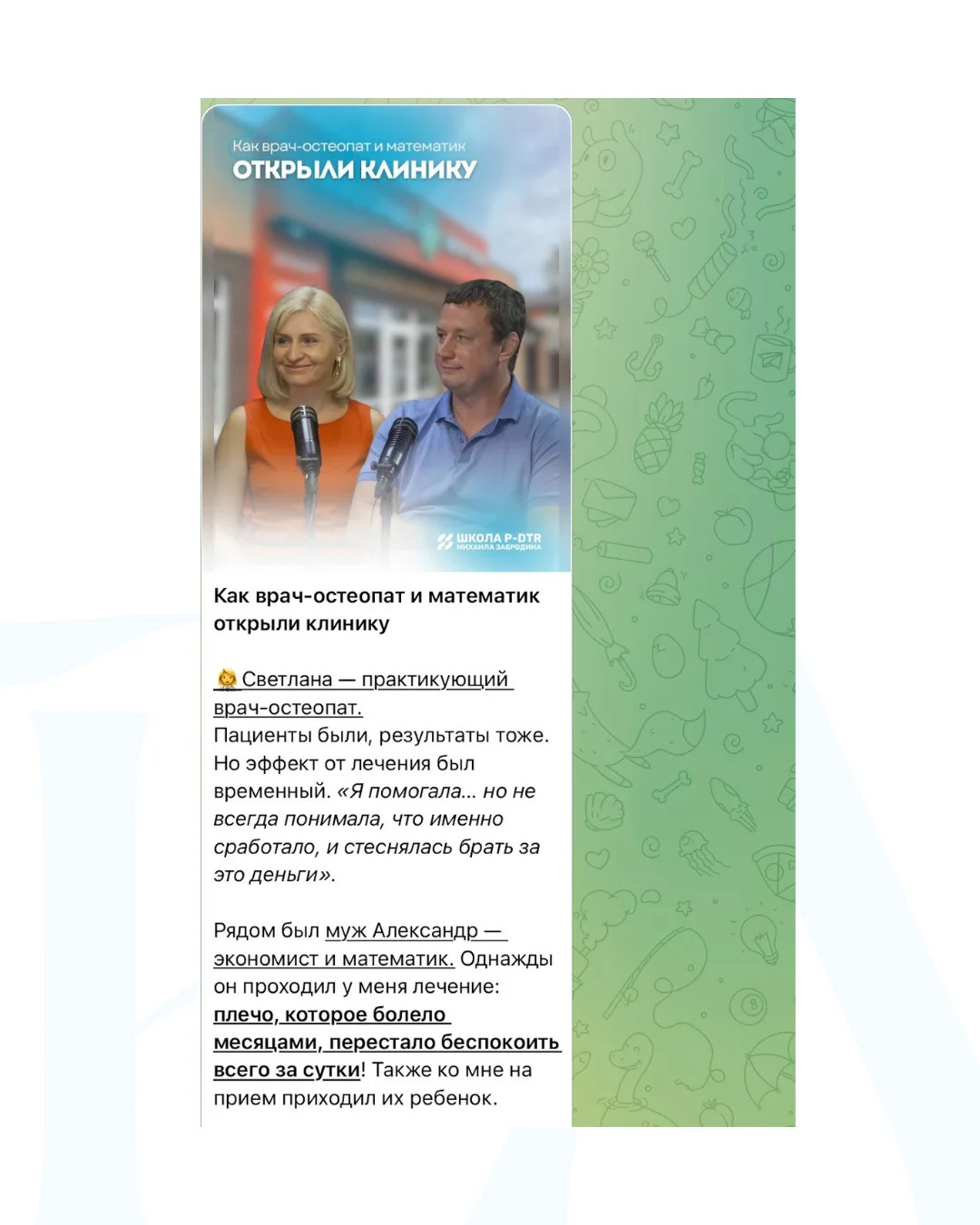 ➌ Результаты учеников Благодаря этому типу контента мы закрывали одно из главных возражений: «Наверное, это очередное обучение, после которого в моей практике ничего не изменится». Через результаты реальных учеников мы показывали применимость метода и выгоду: