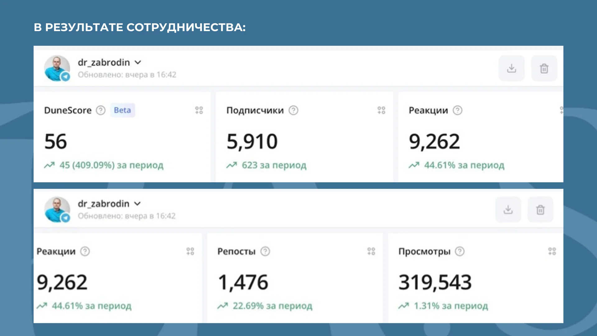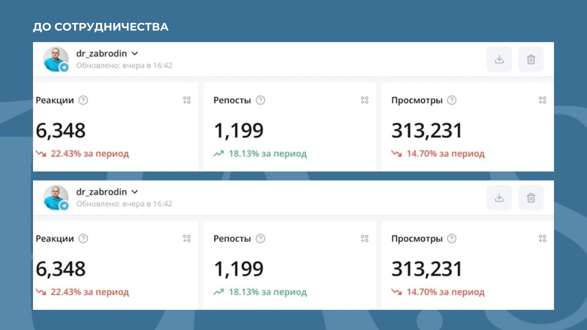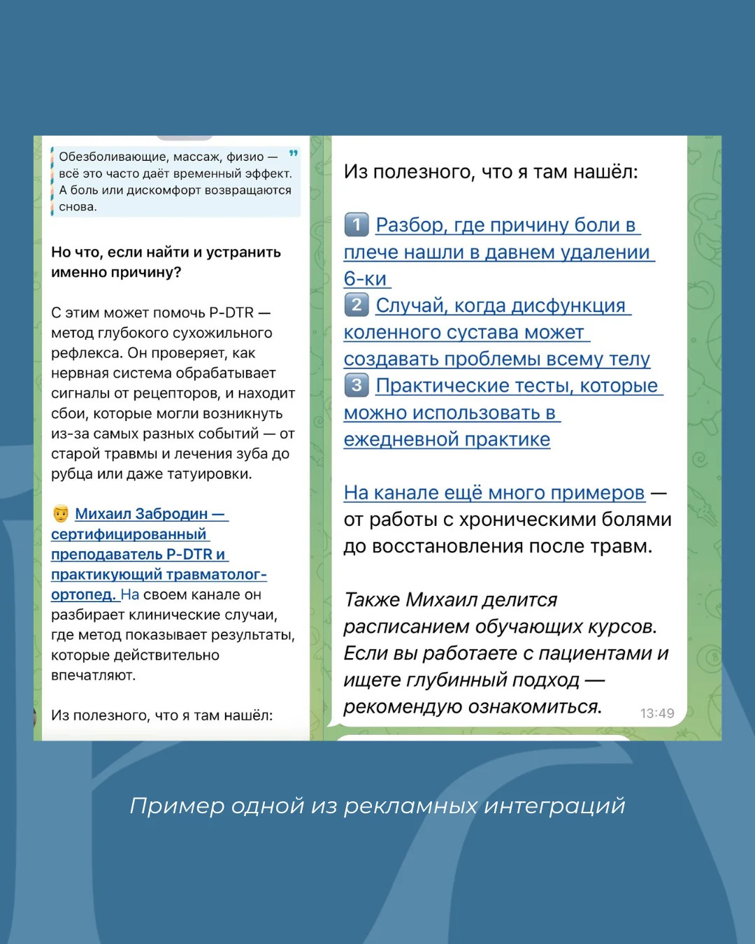 Благодаря рекламе мы привлекли 825 подписчиков. Их средняя стоимость — 187₽, что в 2 раза ниже рыночных и прогнозируемых значений для данного проекта. При этом показатели вовлечённости и обращений росли. Отсюда делаем вывод: в течение всего этого времени мы приводили в канал целевую аудиторию, которая действительно заинтересована в том, что может предложить врач и преподаватель. Несмотря на положительную динамику метрик, ожидания клиента касательно темпов роста были выше. На данном этапе было принято решение приостановить сотрудничество. Тем не менее, за время совместной работы нам удалось выстроить поток релевантных подписчиков и улучшить ключевые метрики канала. Когда аудитория понимает ценность метода, видит результаты коллег и находит ответы на свои вопросы, такая вовлечённость становится естественным следствием работы. А привлечение новой релевантной аудитории позволяет не только улучшать статистику, но и главное — получать целевые обращения. Если ваш Телеграм-канал не оправдывает ожиданий, стоит смотреть глубже: как выстроена работа с трафиком, создание контента и взаимодействие с аудиторией. *Instagram — продукт компании Meta, признанной экстремистской в РФ.