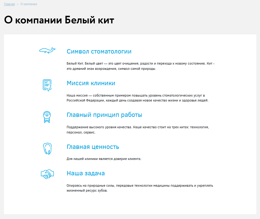 Этот раздел обязательно должен быть на сайте, и он должен быть заполнен подробной информацией об истории компании, ее миссии, ценностях. Обязательно рассказываем про все возможные способы связи с компанией,