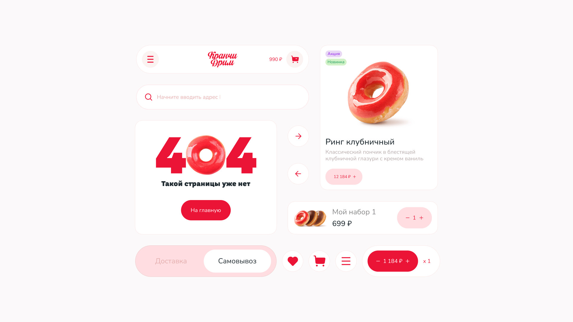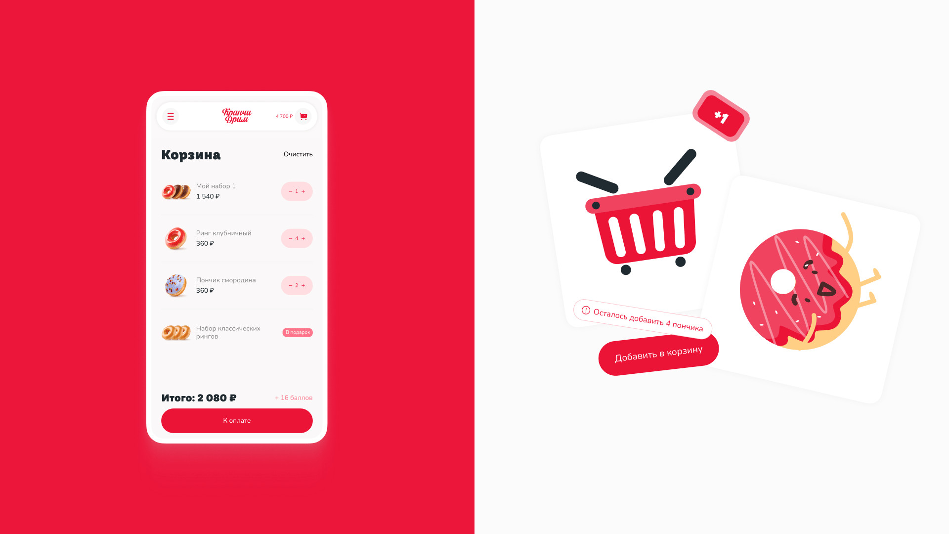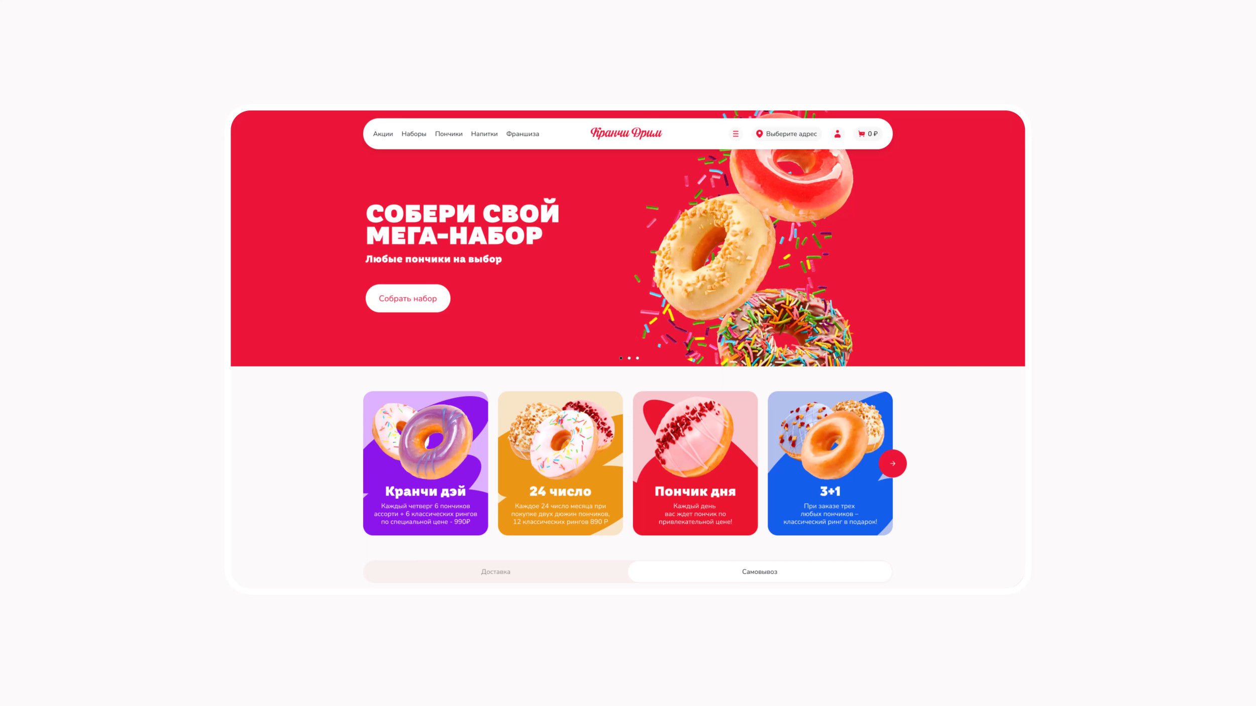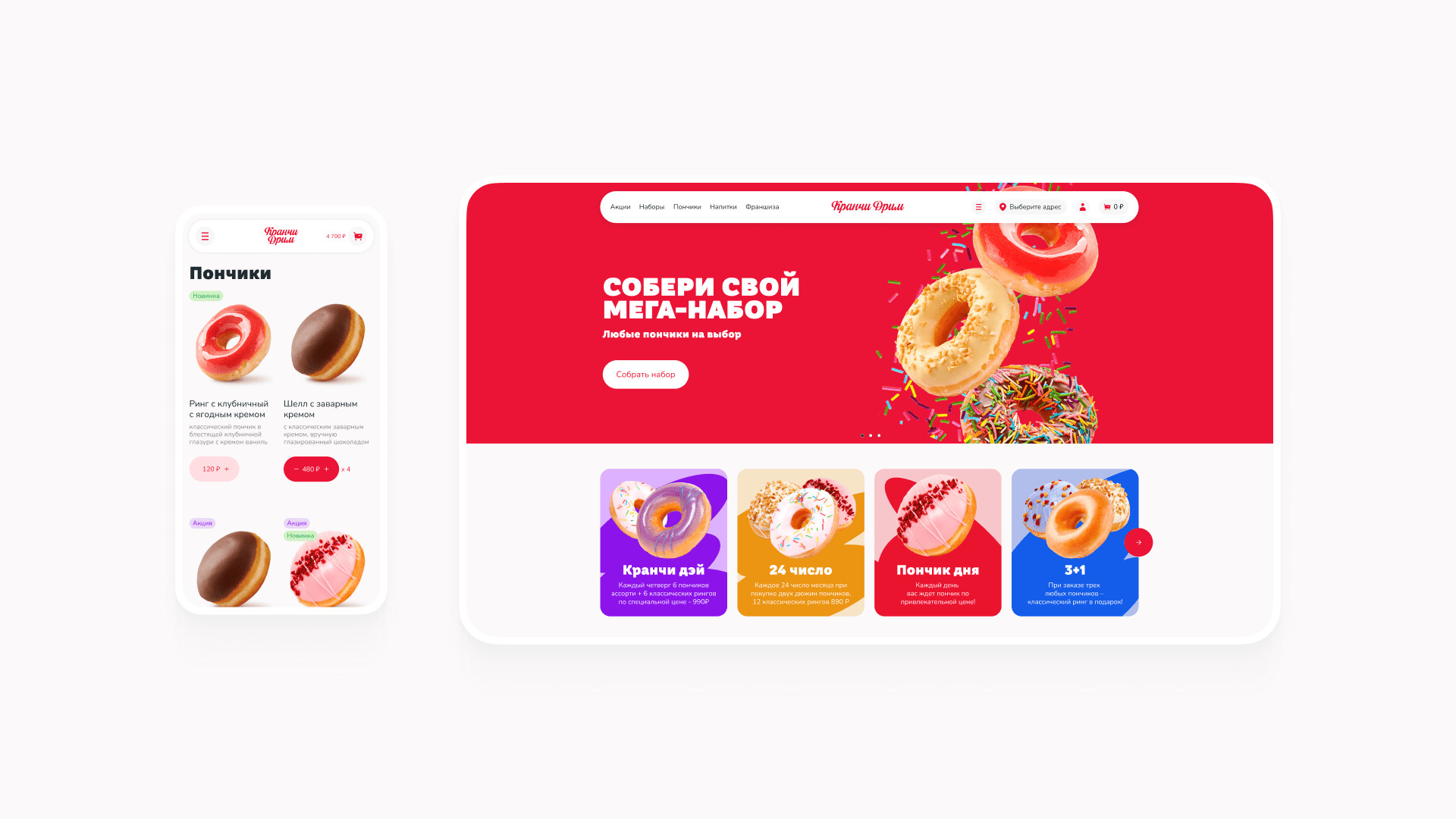 За брендингом ребята обратились к нашим друзьям — тюменскому агентству «Брендгруппа». Они сделали фирмак, а нас порекомендовали как ребят, кто сделает сайт) Кранчи Дрим пришли к нам на редизайн уже сущеcтвующего сайта. Прежний сайт был с морально устаревшим дизайном, не было удобной навигации, оформление доставки отваливалось на полпути. Так, пользователь уходил разочарованный и голодный, а компания теряла деньги. Разработать удобный современный сайт, с которым закроем два запроса заказчика: Сюда вошел набор страниц: главная (интернет-витрина), корзина, чекаут, личный кабинет с историей заказов. Ну и 11 модальных окон со страницами ошибок. Пошли по фреймворку. Определили 3 ключевых сегмента пользователей и их контекст. Составили джобы и выделили 17 ключевых гипотез, 15 глубинных потребностей и 18 болей. После этого нарисовали карту сайта, разработали CJM основных сценариев. Сделали прототип и затестили на пользователях. При разработке CJM мы изучили лучшие практики екома, применимые в нашем случае. Важно было учесть количество филиалов и франшиз кофейни. Пошли по модели интернет-витрины — чтобы сократить время пользователя на выбор и заказ набора пончиков. Сделали 2 разные ветки сценариев взаимодействия: Оставили только самое нужное: профиль и его данные, история заказов и их статусы. Вариант для тех, кто резко захотел пончиков и не хочет проходить регистрацию. Все решается в рамках одной страницы. Заказ пончиков можно сделать в три шага: выбрать набор из каталога → добавить в корзину → оплатить. А что если стандартный набор пончиков не подходит? Сделали фичу — «собрать свой набор». Собрать его можно в поп-апе прямо с главной страницы. При добавлении нужного количества в набор — есть возможность заказать пончики ко времени. У доставки возникает потребность продавать определенные позиции пончиков в большем объеме. Для этого мы придумали фичу — акционный набор: часть пончиков (которые необходимо продать) уже есть в заказе, а часть вы дособираете. Что сделали: Сочно, ярко, вкусно. Расставленные цветовые акценты — управляют вниманием и формируют необходимую реакцию у пользователя. Сделали дизайн-систему так, чтобы любой сотрудник смог обновлять контент на сайте. Про приемы: Для корзины отрисовали иллюстрашки, которые сделали человечными. В декабре релизнули сайт и вот ключевые метрики: Сейчас мы занимаемся сопровождением сайта и дорабатываем фичи, опираясь на метрику. Потыкаться на сайте 🍩 Приложения еще нет, возможно доберемся и до этого. А пока сохраняй «ярлычок» на экран через сафари и заказывай пончики 🤟 Ну после такого пора оформить заказ и делать свой мукбанг на видео)). Мы уже в процессе😅 Макс Пичугин — арт-директор Максим Бурлаченко — руководитель проекта Настя Селивестрова — дизайнер Юра Таранов — технический директор Ильшат Иркин — разработчик Иван Леонов — дизайнер Антон Лобанов — исследователь Кейсы на Dprofile Больше кейсов на сайте Не забывайте подписываться на наш телеграмчик