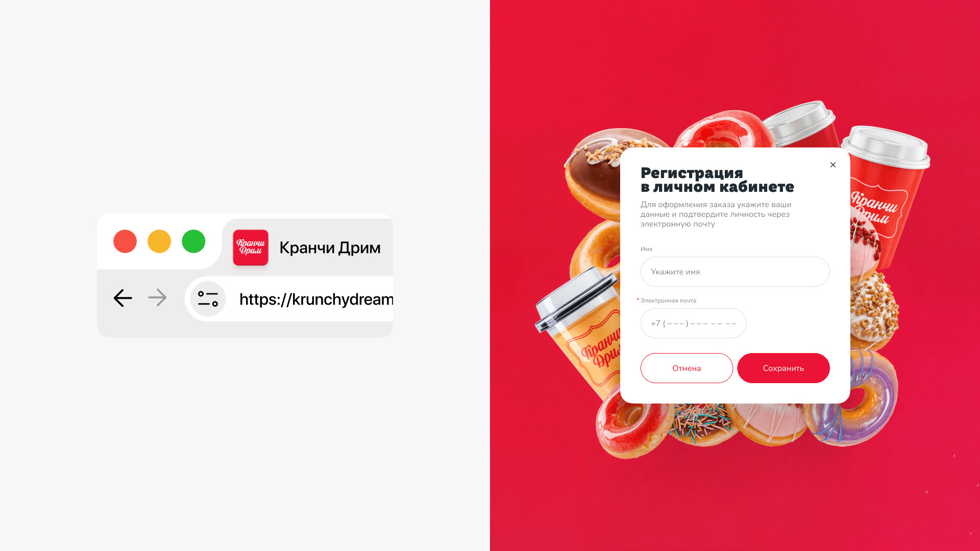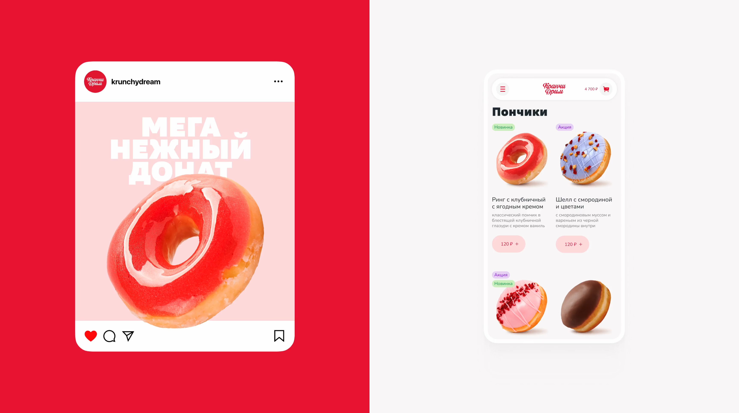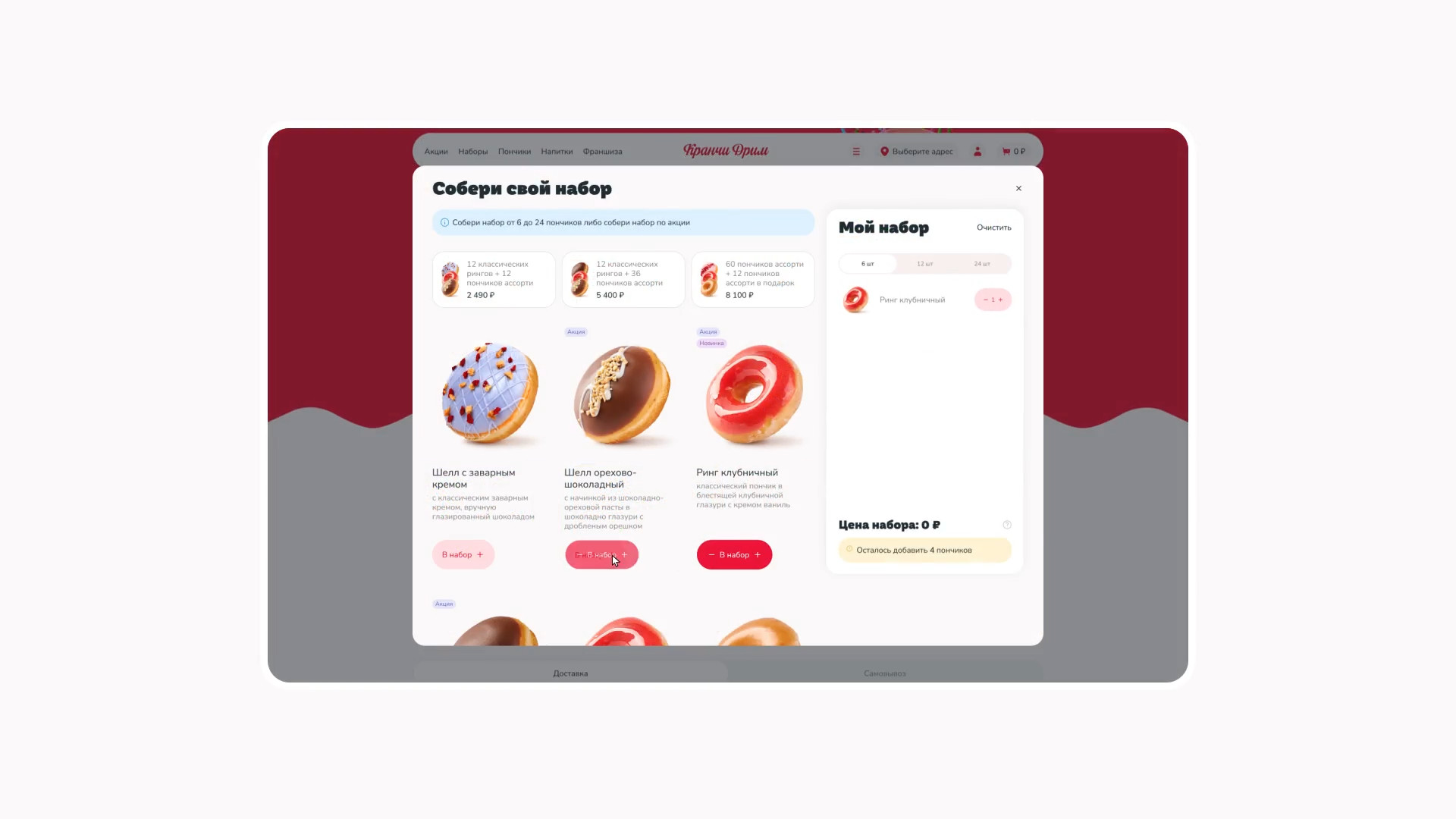 За брендингом ребята обратились к нашим друзьям — тюменскому агентству «Брендгруппа». Они сделали фирмак, а нас порекомендовали как ребят, кто сделает сайт) Кранчи Дрим пришли к нам на редизайн уже сущеcтвующего сайта. Прежний сайт был с морально устаревшим дизайном, не было удобной навигации, оформление доставки отваливалось на полпути. Так, пользователь уходил разочарованный и голодный, а компания теряла деньги. Разработать удобный современный сайт, с которым закроем два запроса заказчика: Сюда вошел набор страниц: главная (интернет-витрина), корзина, чекаут, личный кабинет с историей заказов. Ну и 11 модальных окон со страницами ошибок. Пошли по фреймворку. Определили 3 ключевых сегмента пользователей и их контекст. Составили джобы и выделили 17 ключевых гипотез, 15 глубинных потребностей и 18 болей. После этого нарисовали карту сайта, разработали CJM основных сценариев. Сделали прототип и затестили на пользователях. При разработке CJM мы изучили лучшие практики екома, применимые в нашем случае. Важно было учесть количество филиалов и франшиз кофейни. Пошли по модели интернет-витрины — чтобы сократить время пользователя на выбор и заказ набора пончиков. Сделали 2 разные ветки сценариев взаимодействия: Оставили только самое нужное: профиль и его данные, история заказов и их статусы. Вариант для тех, кто резко захотел пончиков и не хочет проходить регистрацию. Все решается в рамках одной страницы. Заказ пончиков можно сделать в три шага: выбрать набор из каталога → добавить в корзину → оплатить. А что если стандартный набор пончиков не подходит? Сделали фичу — «собрать свой набор». Собрать его можно в поп-апе прямо с главной страницы. При добавлении нужного количества в набор — есть возможность заказать пончики ко времени. У доставки возникает потребность продавать определенные позиции пончиков в большем объеме. Для этого мы придумали фичу — акционный набор: часть пончиков (которые необходимо продать) уже есть в заказе, а часть вы дособираете. Что сделали: Сочно, ярко, вкусно. Расставленные цветовые акценты — управляют вниманием и формируют необходимую реакцию у пользователя. Сделали дизайн-систему так, чтобы любой сотрудник смог обновлять контент на сайте. Про приемы: Для корзины отрисовали иллюстрашки, которые сделали человечными. В декабре релизнули сайт и вот ключевые метрики: Сейчас мы занимаемся сопровождением сайта и дорабатываем фичи, опираясь на метрику. Потыкаться на сайте 🍩 Приложения еще нет, возможно доберемся и до этого. А пока сохраняй «ярлычок» на экран через сафари и заказывай пончики 🤟 Ну после такого пора оформить заказ и делать свой мукбанг на видео)). Мы уже в процессе😅 Макс Пичугин — арт-директор Максим Бурлаченко — руководитель проекта Настя Селивестрова — дизайнер Юра Таранов — технический директор Ильшат Иркин — разработчик Иван Леонов — дизайнер Антон Лобанов — исследователь Кейсы на Dprofile Больше кейсов на сайте Не забывайте подписываться на наш телеграмчик