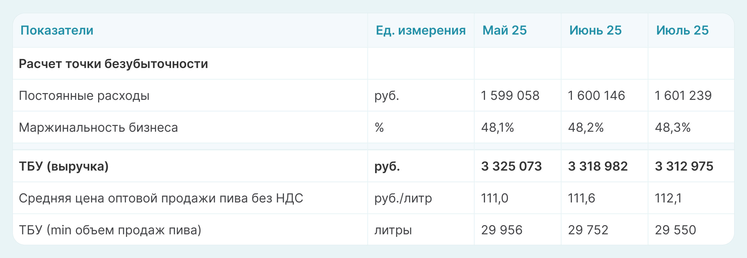 2. Себестоимость 1 литра произведенного пива. За основу брали цифры по калькуляционным картам, которые предоставил завод. Кроме того, учитывались переменные расходы на 1 литр проданной продукции, включая уплату акциза, бонусы за KPI для отдела продаж, а также траты на рекламу и продвижение с августа 2025 года.