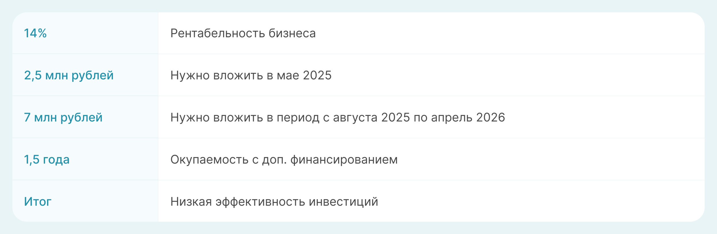 Клиент хотел понимать, спустя какой период времени его вложения начнут генерировать такой денежный поток, которым он смог бы свободно погашать свои обязательства по заемным средствам.