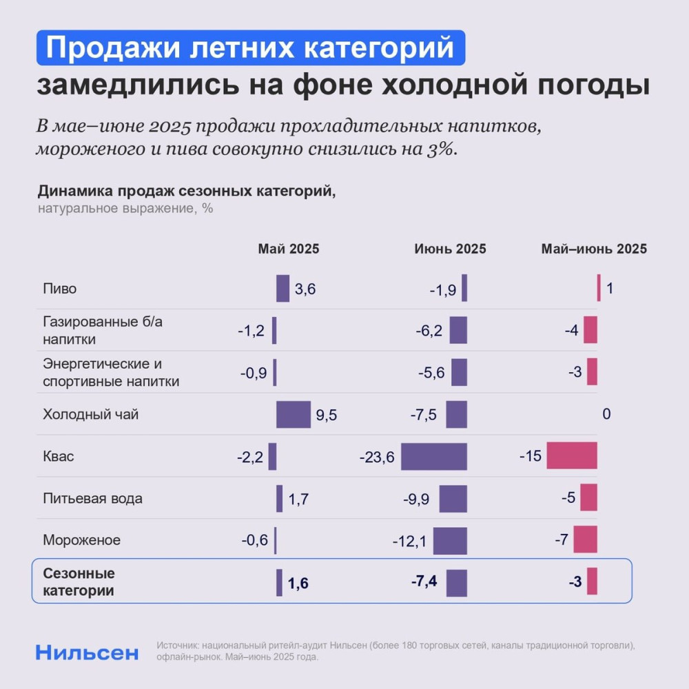 — Мороженое и безалкогольные напитки теряют значительную долю продаж (лето даёт >50% и ~50% их годового оборота).