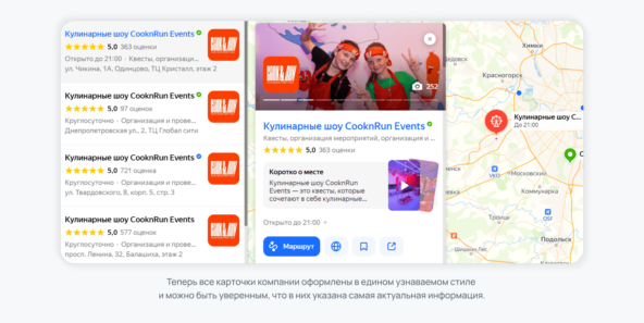 - В карточках должны быть актуальные контакты. Важно, чтобы пользователи могли быстро найти информацию о компании, перейти на сайт или совершить звонок, чтобы узнать подробности и забронировать праздник.