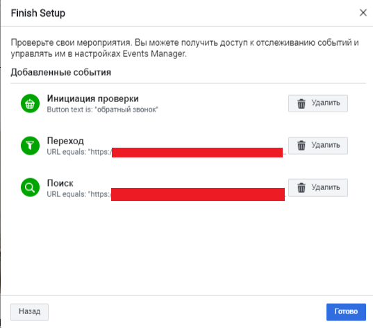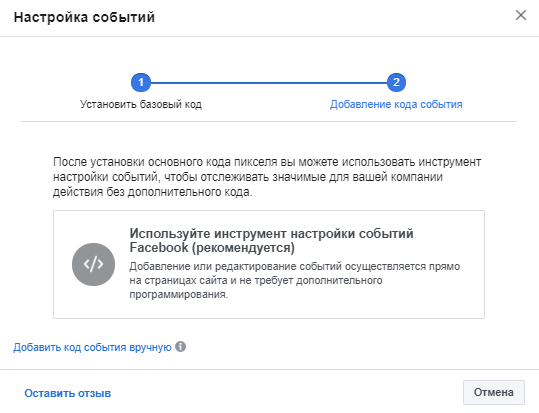 Если требуется отслеживать только посещения страницы «Спасибо за заказ», фиксировать добавление товара в корзину или открытие формы, то достаточно воспользоваться готовым инструментом Facebook. Начать настройку можно кликнув на «Настроить» — «Настроить новые события».