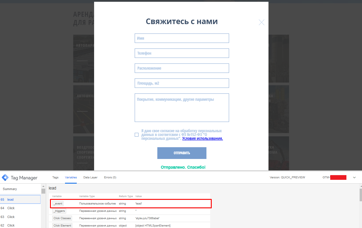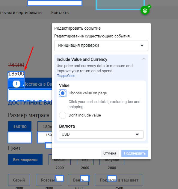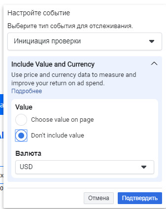 Далее выбираем основной пункт «Использовать инструмент настройки Facebook». Теперь в строке вводим страницу, на которой мы бы хотели отслеживать события, и открываем сайт. На сайте потребуется ознакомиться с инструкцией (открывается поверх сайта). При просмотре сайта в левом верхнем углу появится окно «Facebook Event Setup Tool» для настройки конверсий, которое при необходимости можно переместить в другое удобное место. Далее настраиваем конверсии, которые могут быть двух типов: клик по кнопке и просмотр URL. Например, мы хотим отследить клик по кнопке «Обратный звонок», для этого нажимаем в окне Facebook Event Setup Tool «Отслеживать новую кнопку». Теперь система покажет подсказку в нижней части экрана, что можно скроллить страницу, а нам необходимо кликнуть на элемент, который хотим отследить. Кликаем на кнопку «Обратный звонок» и выбираем нужную категорию события, например: При выборе определенных типов событий система предложит: Если на странице указана цена услуги или товара, то выбираем второй пункт, и система опять предложит выбрать элемент, в котором передается ценность. После выбора нужного элемента ценность появится в инструменте, и нам останется выбрать валюту (по умолчанию установлен доллар США). Все готово, конверсия создана. В инструменте настройки целей кликаем на «Отслеживать URL». После аналогично выбираем категорию события. Аналогично отслеживанию кнопки это могут быть покупка, регистрация, добавление в корзину или, например, просмотр контента. И выбираем правило срабатывания: При необходимости также выбираем ценность конверсии и завершаем настройку (кнопка Finish Setup). Инструмент предложит удалить при необходимости лишние конверсии (или тестовые). После этого система предложит протестировать события. В некоторых случаях отслеживать посещение страницы или клик по элементу недостаточно: есть события, которые учитывают другие действия, например: Для их фиксации конверсии необходимо использовать более сложные правила. И в этом случае лучше использовать Google Tag Manager. Давайте разбираться на примере. Переходим в Ads Manager, кликаем на «Настроить» — «Новые события», но далее переходим на «Добавить код вручную». В появившемся окне выбираем категорию бизнеса и ниже нужный тип конверсии. Важно! Дальнейшие настройки могут меняться в зависимости от выбранной цели. Например, выбираем стандартную «Лид». Вводим ценность конверсии и выбираем валюту, она указывается в трехбуквенном коде по ISO 4217 (для рубля RUB, для евро EUR). Затем копируем код. Далее переходим в Google Tag Manager и включаем «Предварительный просмотр». Переходим на сайт и выполняем нужное действие на сайте, например, отправляем форму. Видим, что при отправке формы, срабатывает событие lead. Его мы и будем использовать в качестве триггера. Возвращаемся в GTM во вкладку «Триггеры» и создаем новый. Даем ему название и выбираем его тип. В нашем случае это «Пользовательское событие». Вводим нужный event — lead. Переходим в «Теги» и создаем новый. Даем тегу название, например, Facebook lead и выбираем его тип. В появившемся списке кликаем на «Пользовательский HTML». Копируем в открывшееся окно код из настроек Facebook Pixel и переходим к настройкам триггера. Выбираем созданный ранее триггер с пользовательским событием. Сохраняем тег. Публикуем новую версию. Все готово. Теперь при выполнении нужного действия — в нашем случае 
