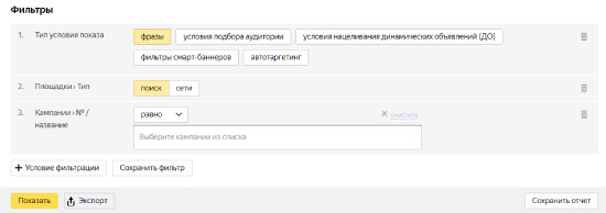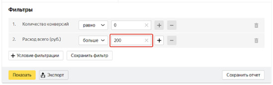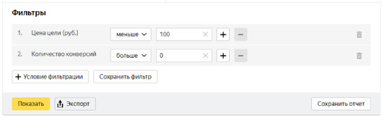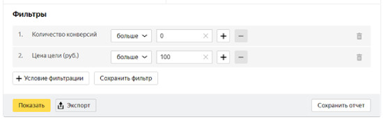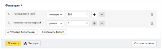 Зайти в «Мастер отчетов» можно на уровне всего аккаунта: Или в статистику конкретной кампании: Мастер отчетов — это основной инструмент для анализа эффективности рекламных кампаний Директа с небольшими бюджетами. Когда источников и кампаний становится много, рекомендуется использовать дополнительные инструменты для сбора и визуализации данных статистики, например, мониторинг в eLama. Анализ кампаний нужно начать с уровня аккаунта. Для этого нужно построить отчет по всем рекламным кампаниям за определенный период времени. Не забудьте выбрать необходимые цели в пункте «Данные по целям», чтобы оценивать эффективность по важным бизнес-метрикам, которые определили при планировании. В отчете можно сделать сортировку по стоимости конверсии от меньшей к большей. Рекламные кампании, которые укладываются в KPI по стоимости конверсии, пока что можно не трогать — на них мы перераспределяем часть бюджета с менее успешных кампаний, то есть увеличиваем дневной бюджет, чтобы масштабировать успех. Рекламные кампании, которые не укладываются в KPI, нужно оптимизировать в первую очередь, ведь они прямо сейчас тратят деньги неэффективно. Поисковая реклама призвана привлекать наиболее целевую аудиторию со сформированным спросом. В качестве таргетингов используются ключевые слова или автотаргетинг, но при ограниченном бюджете на старте автотаргетинг лучше отключить. Ключевые слова охватывают множество поисковых запросов, как вложенных (с более длинными «хвостами»), так и близких по значению (семантическое сходство). В первую очередь оптимизировать нужно именно поисковые запросы: вычищать явно нерелевантные, неэффективные, по которым бюджет расходуется впустую. Существует заблуждение о том, что если добавить на старте большой список минус-слов или «закавычить» все фразы, то за поисковыми запросами можно будет не следить вообще. Практика показывает, что даже глубокая проработка семантики с помощью парсеров не позволяет вычистить все нецелевые запросы. Кроме того, Директ щедро расходует бюджет рекламодателей на запросы по фразам, которые подбирает автоматически. Раньше они назывались синонимами, сейчас семантическим соответствием. Суть не поменялась: отключить их показ в настройках невозможно, поэтому после запуска кампании нужно каждый день заходить в отчет и добавлять новые минус-слова и минус-фразы в кампанию, так как большая часть таких фраз часто не подходит для продвижения. В отчетах Директа можно настраивать различные фильтры. Для ежедневного или еженедельного мониторинга запросов пригодится фильтр по типу соответствия — семантическое. После оптимизации кампании по поисковым запросам можно переходить к ключевым фразам. Обычно ключевики, добавленные в кампанию, являются релевантными и целевыми. Иначе зачем они были добавлены в кампанию? Поскольку фразы целевые, они должны приводить целевую качественную аудиторию на сайт. Из этого можно сделать вывод о том, что если ключевая фраза неэффективна, стоит подумать о качестве рекламных объявлений, посадочных страниц и оффера в целом. Главный вопрос: «Почему люди, которые проявили явный интерес к вашему продукту, не совершают конверсию?» Возможно, проблема не во фразе, а, например, в конкуренте, который прямо сейчас запустил более выгодную акцию при прочих равных условиях. Ве