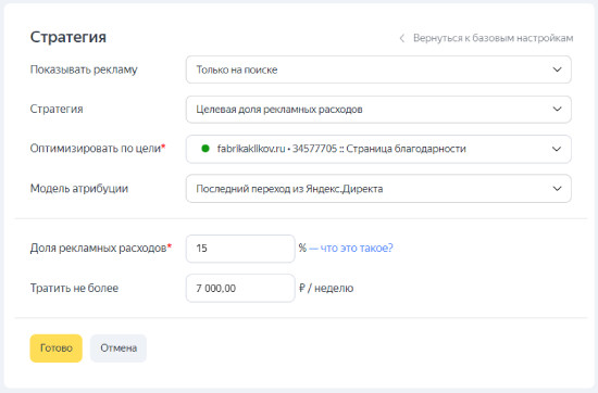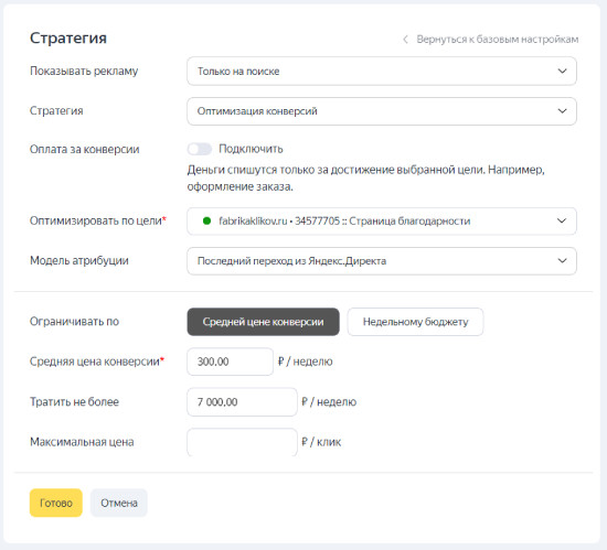 Также нужно еще до запуска рекламы определить ключевые метрики, по которым будет оцениваться эффективность кампаний. Обычно это количество (CV) и стоимость конверсий (CPA/CPL). Если в Метрику корректно передаются данные электронной торговли или ценности, настроена сквозная аналитика, то можно использовать такие метрики, как доход, рентабельность и доля рекламных расходов.