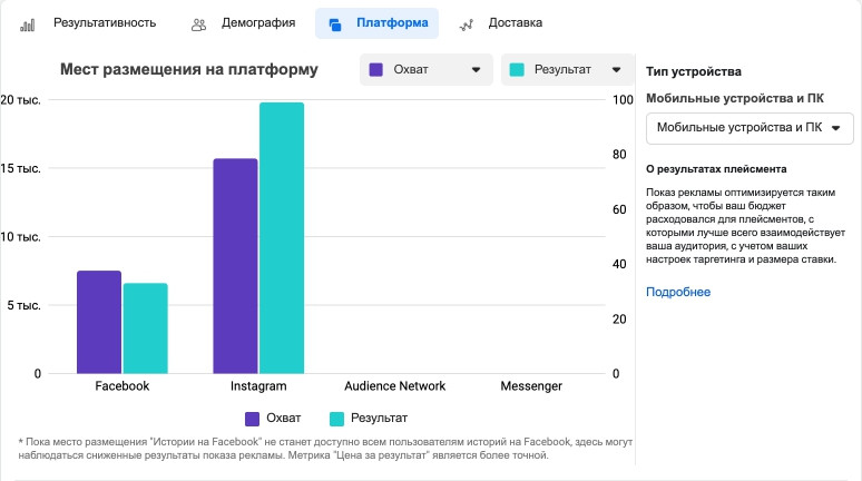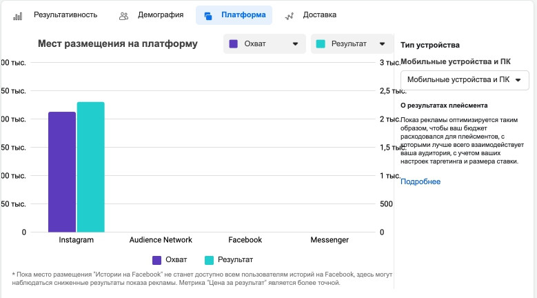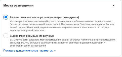 При выборе автоматического размещения Facebook сам решает, как распределить бюджет между площадками и где показывать рекламу чаще. Это связано с тем, что Facebook сам обучается во время показа рекламы. Таргетинг работает одинаково во всех местах размещения, поэтому при использовании большего количества мест размещения вы можете привлечь более широкую аудиторию.