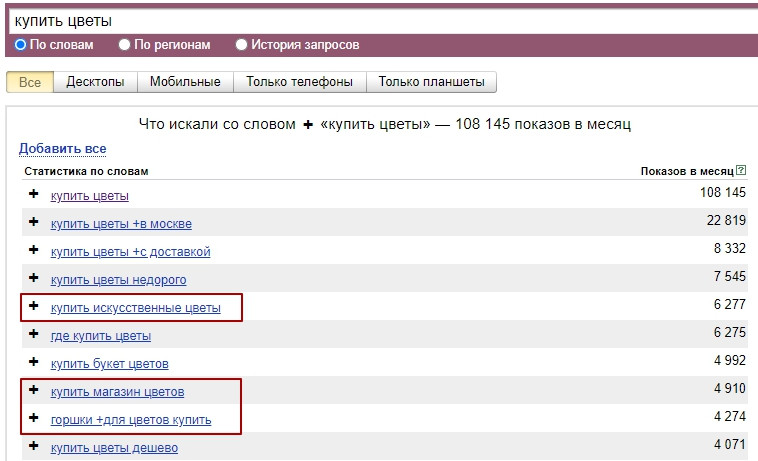 Этот список можно будет использовать при парсинге запросов в KeyCollector и сборе масок в Wordstat. Маски — это базовые запросы, основа семантического ядра, состоящая из одного, двух или трех наиболее высокочастотных слов, характеризующих продвигаемый товар или услугу. Например, если клиент продает автомобили Toyota, то масками для этого товара будут «Toyota», «купить автомобиль Toyota», «автомобиль Toyota», «Toyota Camry» и другие.
