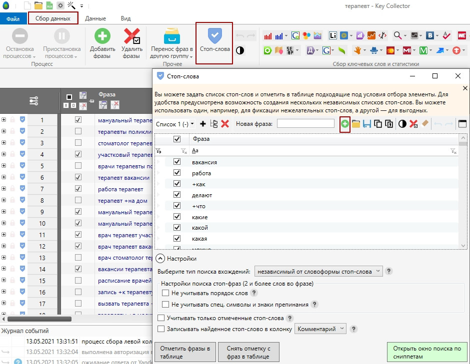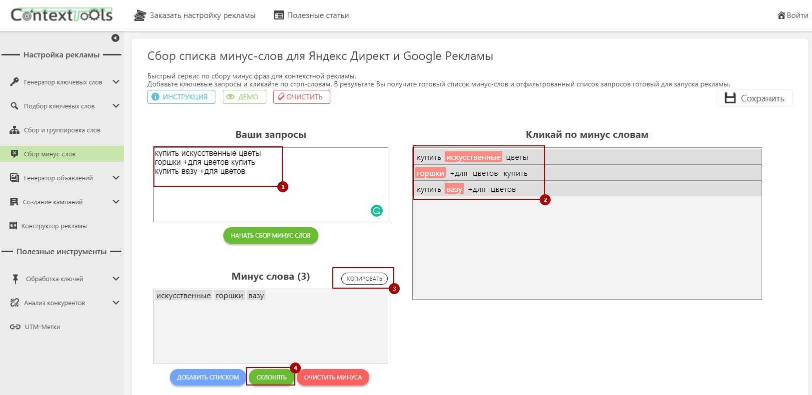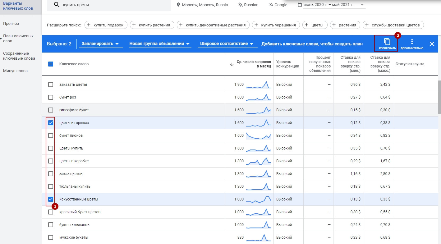Допустим, вы продвигаете цветочный магазин. Введите в Wordstat по очереди наиболее целевые высокочастотные запросы: «купить цветы», «доставка цветов» и т. д. Вы увидите, что часть аудитории, которая их вводит, для вас нецелевая — например, вы не продаете искусственные цветы, горшки для цветов и не планируете продавать свой магазин: Слова «искусственные» и «горшки» вы можете добавить в список минус-слов. Со словом «магазин» сложнее. Вас могут искать по запросу «магазин цветов». Поэтому само слово «магазин» в минус-слова добавлять не нужно, но можно добавить всю фразу целиком — «купить магазин цветов». Установите расширение Wordstat.Assistant для более удобного сбора ключевых слов. После установки расширения добавьте через знак плюса те запросы, по которым не хотите показывать рекламу, и скопируйте их через иконку копирования. Далее перейдите в сервис для выделения минус-слов из поисковых запросов Context Tools. Вставьте скопированные запросы в поле «Ваши запросы» и нажмите «Начать сбор минус-слов». В соседнем окне появятся запросы, разбитые по словам. Кликайте на слова, которые хотите добавить в список минус-слов. В поле «Минус слова» ниже появится готовый список. Тут же вы можете просклонять их для Google Ads. Для дополнительных базовых запросов или для сбора более актуального ядра для Google Ads подойдет Планировщик от Google. Создайте новый план в Планировщике ключевых слов. Отсортируйте фразы в порядке убывания частотности. Отметьте нецелевые запросы галочкой и скопируйте выбранные запросы. Выделить минус-слова можно через сервис Context Tools, как описано в предыдущем разделе. Перед сбором ключевых слов можно добавить в исключения готовые списки ключей по вашей тематике. Можно воспользоваться специальными сервисами по подбору минус-слов, например, Prodalet . Это позволит сократить время на чистку запросов в дальнейшем. Но перед добавлением все же просмотрите этот список, чтобы в нем не оказалось целевых для вас запросов. KeyCollector — это профессиональная программа для PPC-специалистов, которая помогает в сборе семантического ядра, отборе наиболее эффективных фраз, формировании списков минус-слов и организации структуры ядра. Перед парсингом добавьте очевидные минус-слова в окно стоп-слов, чтобы меньше времени ушло на минусовку собранного ядра. На вкладке «Сбор данных» перейдите в раздел «Стоп-слова», нажмите зеленую кнопку с плюсом. Добавьте те слова и фразы, которые не должны быть в запросах, и сохраните: После того, как вы собрали ядро в KeyCollector, через опцию «Анализ групп» сформируйте список минус-слов. Выберите вкладку «Данные» слева вверху окна программы, ниже нажмите «Анализ групп». Отмечайте галочками нецелевые для вашего бизнеса слова и фразы, по которым вы не хотите показывать рекламу: На одно из отмеченных слов нажмите правой кнопкой мыши и во всплывающем окне выберите пункт «Отправить все слова из определений целиком отмеченных групп в окно стоп-слов»: Выделите все слова, которые нужно отправить в минус-слова, и нажмите «Добавить в стоп-слова». Чтобы скопировать получившийся список минус-слов, перейдите в раздел «Стоп-слова» и нажмите одну из иконок копирования: каждое слово с новой строки или через запятую. Чтобы просклонять минус-слова для Google Ads, воспользуйтесь сервисом Context Tools. Вставьте в окно для склонения скопированный список минус-слов и нажм