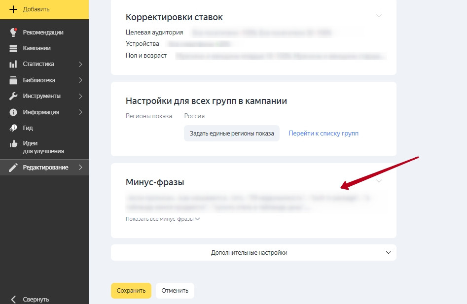 Минус-слова — это слова или фразы, частично или полностью обозначающие поисковые запросы пользователей, по которым рекламодатель не хочет показывать объявления, так как они не приведут к конверсии и будут тратить впустую рекламный бюджет. Добавление минус-слов в настройки рекламной кампании позволяет увеличить количество целевых переходов и снизить стоимость клика.