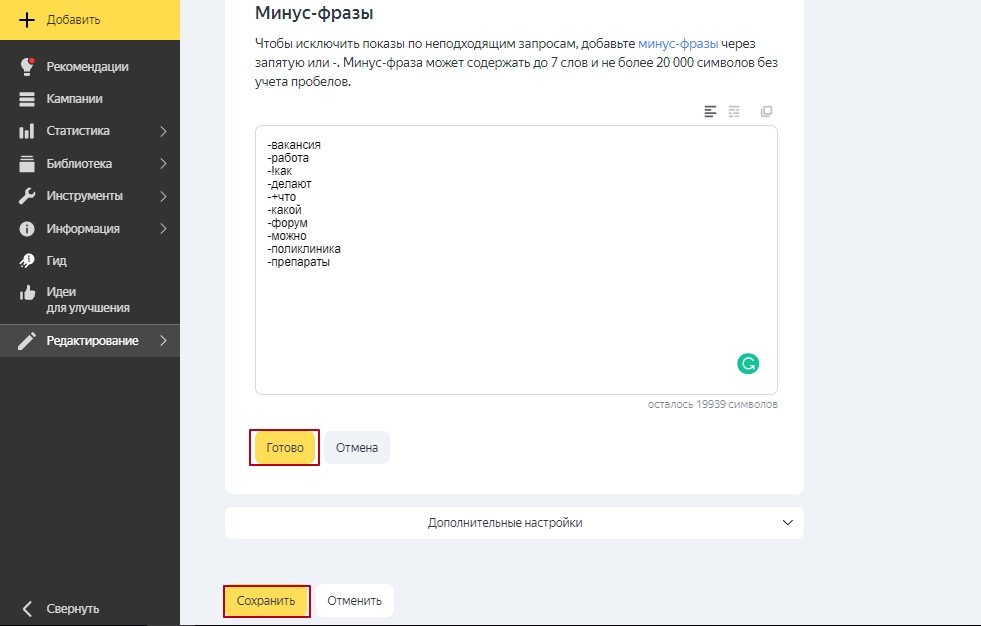 Если компания на связи с 10 до 18 часов и может только в это время отвечать на заявки и звонки потенциальных клиентов, то слово «круглосуточно» можно добавить в минус-слова. Если клиент предлагает товары или услуги премиального качества для обеспеченной аудитории, в минус-слова логично сразу добавить «дешево», «бесплатно», «недорого», «скидка». Если компания доставляет продукты только по территории, ограниченной третьим транспортным кольцом в Москве, в минус-слова можно добавить станции метро, которые располагаются за ТТК: Щукинскую, Фили и другие.