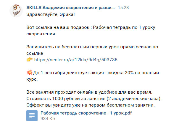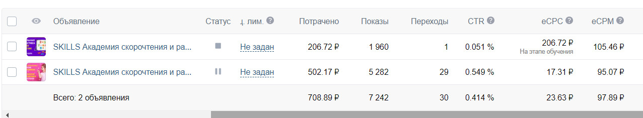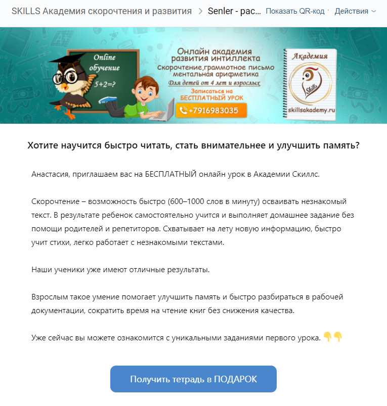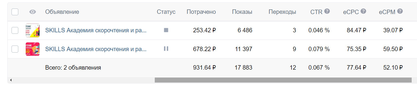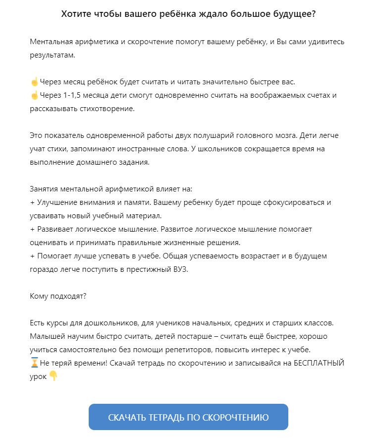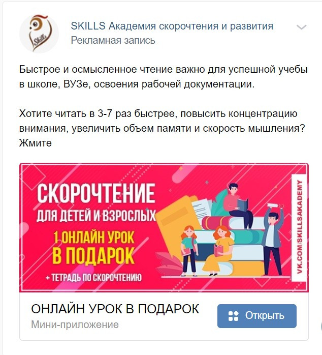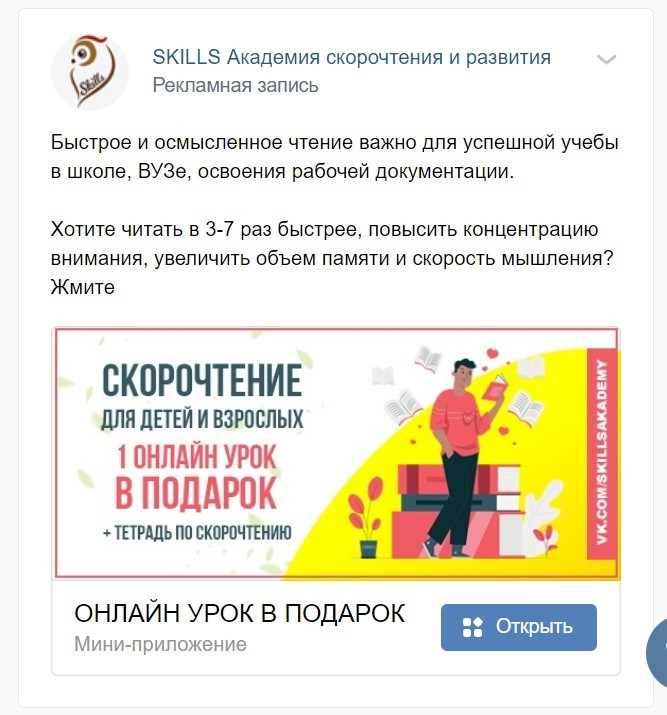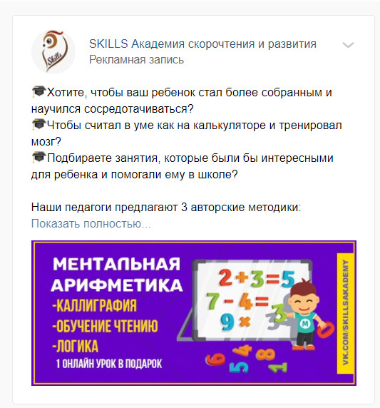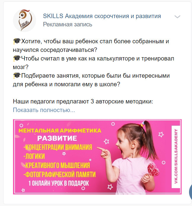 Мы проанализировали контент группы во «ВКонтакте»: в основном, это были развивающие упражнения для детей. Такой контент полезен для родителей, которые активно ищут кружки для отдохнувших после каникул детей. Перед запуском рекламы мы доработали сообщество: добавили обложку, услуги с ценами, прописали преимущества, опубликовали несколько постов, чтобы показать экспертность преподавателя и закрыть возражения целевой аудитории. Прежде чем настраивать таргетированную рекламу, мы подготовили автоворонку из двух шагов: 1. Мини-лендинг с лид-магнитом. Людей c рекламы мы решили вести на мини-лендинг — здесь они могли зарегистрироваться на бесплатное занятие и скачать рабочую тетрадь по скорочтению. Чтобы получить ее, им нужно было подписаться на рассылку во «ВКонтакте» — тетрадь приходила сразу же в первом сообщении. 2. Прогревающая рассылка во «ВКонтакте». Как только пользователь подписывался на рассылку, он получал первое письмо с подарком. Далее в течение трех—четырех дней ему приходили прогревающие письма. После этого мы предлагали бонус — скидку 20% на полный курс. Елена работает онлайн, поэтому привязки к географии у нас не было. Она решила запустить продвижение услуг репетитора не только по скорочтению, но и по другим направлениям, чтобы отдавать репетиторам учеников за небольшую комиссию. Такой подход к продвижению услуг репетитора привлекает больше клиентов, так как нет ограничений по узкой специализации и предоставляется выбор курсов. Например, кто-то сначала займется информатикой, а после придет осваивать скорочтение. Мы создали пять разных объявлений для продвижения репетитора, настроили их на разные аудитории и запустили тесты с бюджетом по 100 рублей. Этой суммы было достаточно, чтобы понять, работает объявление или нет. Таргетировались по возрасту, полу, городу, интересам, активным пользователям сообществ конкурентов. Детям 6–14 лет рекламу не показывали вообще. В тестах использовали объявления с кнопкой и универсальные записи с возможностью перехода по ссылке. В баннеры добавили графические элементы и фотографии детей. Наибольшую конверсию принесло объявление с длинным текстом, затрагивающим боли и мечты клиента. В объявлении мы сделали акцент на распространенных проблемах детей при обучении в школе, показали пути их решения, дали ответы на основные вопросы и указали наши преимущества перед конкурентами. Также в этом объявлении использовали яркий креатив с фото ребенка. Реклама была настроена на основной сегмент — матерей в возрасте 30–45 лет. Конверсия с этой рекламы была наиболее высокая — 0,549%. Затраты в 502 рубля принесли 29 лидов. Хуже результаты показало объявление с тем же текстом, но с другим креативом: более темные цвета, графический рисунок вместо фото, менее четкие УТП. Конверсия с этой рекламы — 0,051%. Затраты в 207 рублей принесли один лид. В записях с кнопкой также лучше отработал креатив с более ярким фоном. Конверсия с первого объявления — 0,079%, а со второго — 0,046%. После продаж курса по первым заявкам из рекламы «ВКонтакте» приступили к разработке многостраничного сайта. Результат рекламной кампании был бы значительно выше, если бы сайт был готов до запуска рекламы и мы смогли бы вести аудиторию из «ВКонтакте» туда. На сайт рекомендуем добавить ссылки на соцсети и призыв подписаться. Уже с сайта с