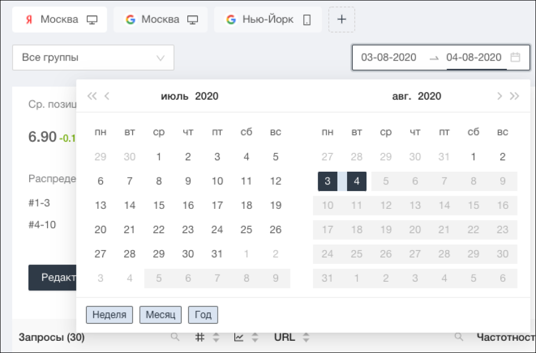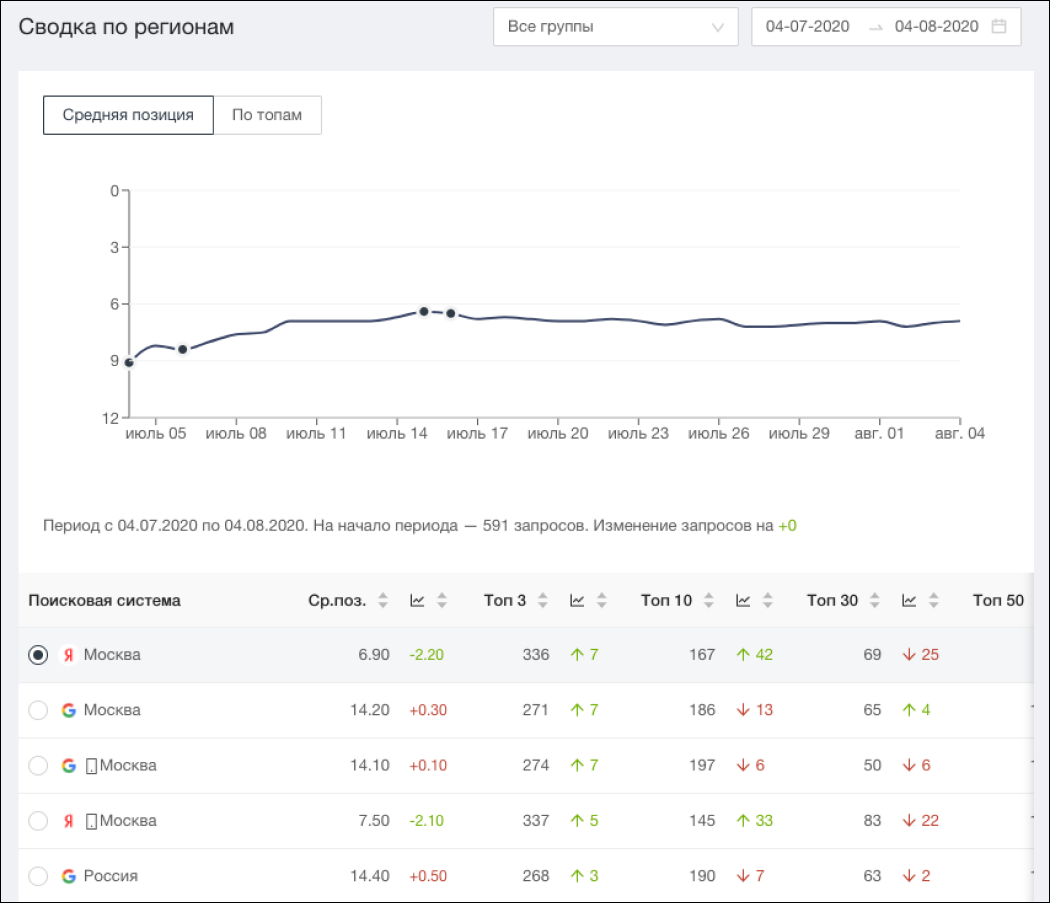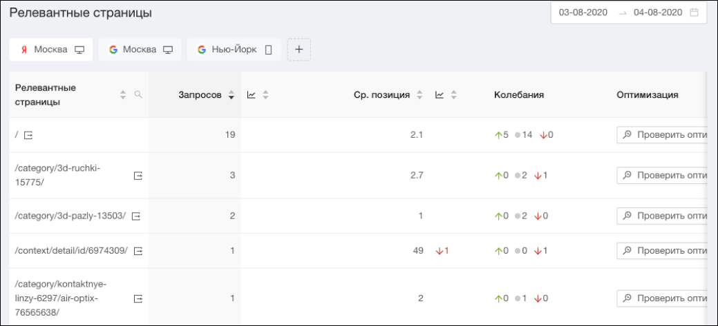 Проект — это набор взаимосвязанной информации о сайте: его трафик, индексация, ссылочная масса, уровень оптимизации контента как главной, так и внутренних страниц, позиции и технические параметры вплоть до шрифтов и разных плагинов. Настройка в несколько простых шагов — добавление сайта, конкурентов и ключевых слов. Можно по желанию привязать системы статистики. Мы каждый день обновляем информацию по всем пунктам, чтобы пользователи в любой момент могли посмотреть, что изменилось в позициях или, например, на какой-нибудь из внутренних страниц. Эту модель выбрали, потому что пользователи не раз говорили, что им неудобно иметь много учеток на разных сервисах, постоянно сопоставлять данные и вообще держать кучу открытых вкладок. В этой статье расскажем подробнее о модуле проверки позиций, над которым в последнее время работаем больше всего. Итак, что умеет проверка позиций. Перед отслеживанием позиций пользователи добавляют ключевые слова. Мы сделали так, чтобы каждому запросу можно было присвоить сразу несколько групп — так удобнее сортировать запросы по частотности или по категории товара. Можно посмотреть сводку по выбранному региону или по любой группе. По просьбам пользователей сделали возможность посмотреть даты добавления новых запросов, чтобы не удивляться проседанию графика, когда появились ключи, еще не попавшие в топ. А еще сделали сводку «По топам». Там можно посмотреть количество запросов, которые находятся в топ-3, 10, 30 и топ-50. Ничего необычного, просто очень удобный календарь, где можно выбрать нужные даты или один из предложенных промежутков времени — неделя, месяц или год. Супербыстный экспорт файла csv для любых целей. Можно отфильтровать результаты проверки как угодно и загрузить в удобном виде. В отличие от нашего старого сервиса для проверки позиций, проверка частотности тут тоже включена в тариф. Пока работает только по Яндекс.Вордстату, в дальнейшем в планах показывать частотность и по Google.Частотность запросов Отчет для тех, у кого много групп запросов. Показывает для каждой среднюю позицию (поэтому мы не рекомендуем добавлять в группу сразу сотню слов), ее изменения за заданные даты и колебания, то есть сколько запросов поменяли позицию в выдаче в большую или меньшую сторону. Отчет по релевантным страницам показывает URL по запросам пользователя, которые мы получили из выдачи. Если ключи плохо разделены на группы, в этом отчете можно посмотреть сводку по разделам сайта. А еще для каждого URL добавили кнопку проверки оптимизации страницы — это наш небольшой бесплатный инструмент, который круто дополняет проверку позиций. Наша аудитория — это в основном новички, которые только начали разбираться в SEO, или владельцы бизнеса, которым нет большой нужды разбираться, но они хотят говорить на одном языке с подрядчиком по продвижению. С учетом этого, направление оказалось верным. Сервис не дает слишком много подробной информации, в которой легко запутаться, но показывает общую картину и дает понимание, в какую сторону двигаться дальше. Сейчас мы собираем фидбек у пользователей через опросы и проводим интервью, хотя в последний год это стало непрерывным процессом. Если вы пользуетесь «Анализом сайта», напишите в комментариях, что думаете — стало ли вам проще и удобнее или наоборот, раньше сервис нравился бо