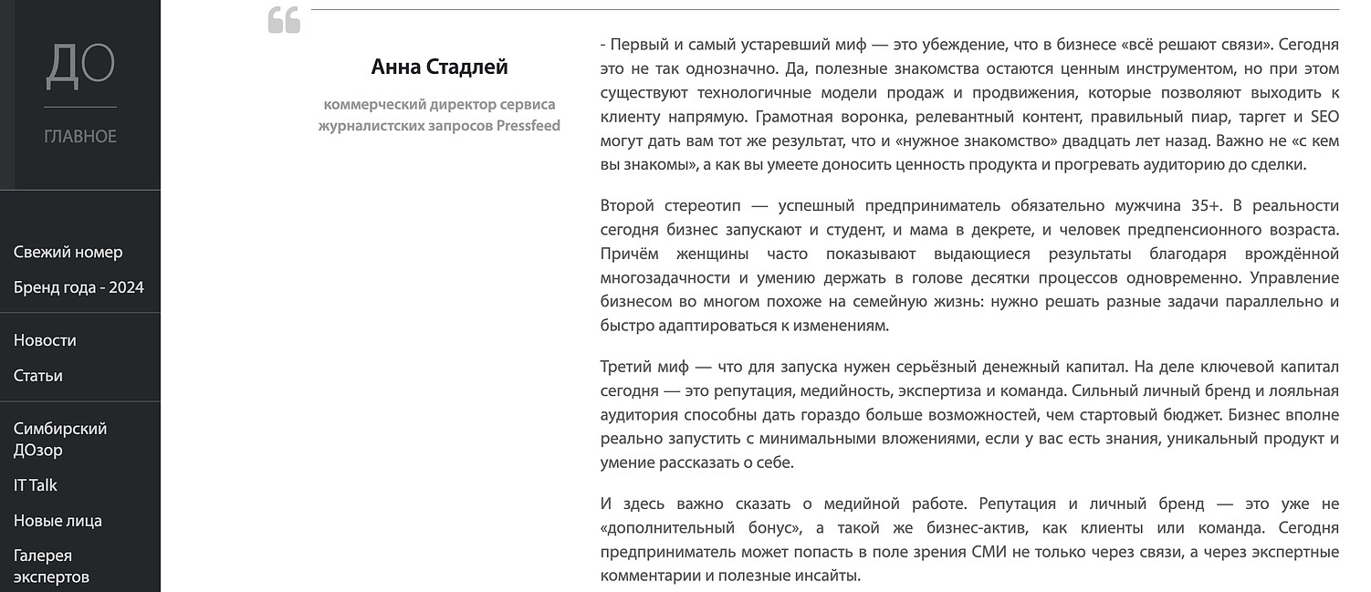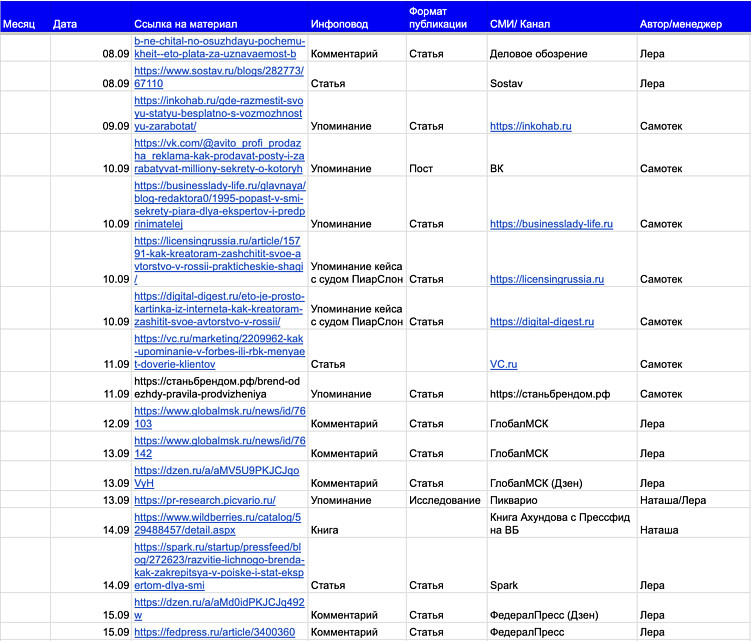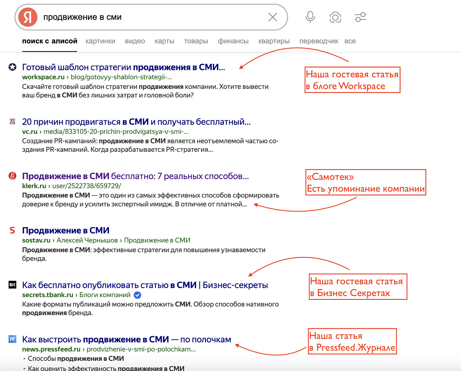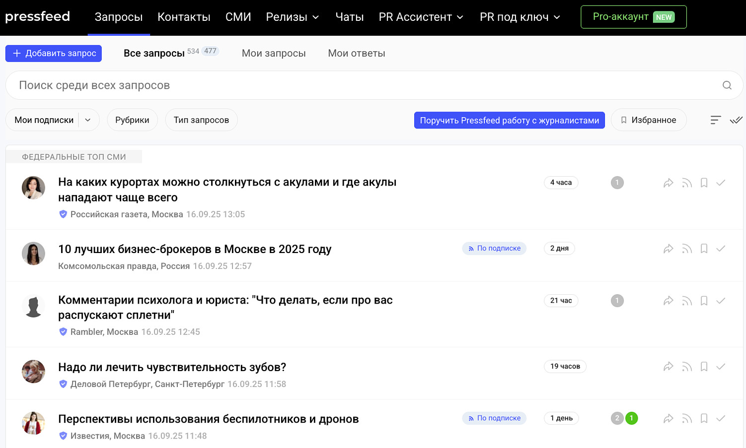 Очень полезно собирать все упоминания в одну таблицу и отмечать, кто и что писал — так вы сразу видите картину. Можно добавить и PR-поинты, чтобы отслеживать, где появляются возможности для публикаций или комментариев. Например, в Pressfeed мы собираем все упоминания сервиса в сети и анализируем, что нужно подчеркнуть, а что нейтрализовать. Это даёт полный контроль и помогает реагировать вовремя. Можно искать упоминания компании вручную, но удобнее через сервисы: Эти сервисы работают в России и помогут держать руку на пульсе репутации. Остальные зарубежные инструменты вроде Brandwatch, Mention, Awario и Keyhole лучше использовать для глобального мониторинга, если это актуально. Реагируйте на отзывы и упоминания — не только на прямые обращения, но и на любые обсуждения. Авиасейлс и Т-Банк комментируют почти всё, где их упоминают. Особенно важно не оставлять без внимания негатив: нет ничего хуже неотвеченного недовольства. Назначьте ответственного, следите за упоминаниями и отвечайте вовремя — даже короткое «Спасибо за обратную связь» творит чудеса. Для упрощения работы с отзывами можно использовать специальные сервисы и ботов. Например: Эти инструменты помогают быстро видеть новые отзывы, оценивать их тональность и вовремя реагировать, чтобы негатив не накапливался, а положительные отклики усиливали доверие. Следите за тем, что люди видят первым в поиске. Наполняйте топ поиска своим контентом, публикациями в СМИ и отзывами. Если появляется негатив, вытесняйте его качественным контентом. Это работает как щит — первое впечатление формируется мгновенно. Самое главное — это первая страница поиска. Именно топ‑10, а ещё больше топ‑3 формируют мнение о вас. Попробуйте прямо сейчас: загуглите своё имя, компанию или продукт. Скорее всего, именно эти ссылки и определяют, доверится ли вам человек или уйдёт к конкуренту. Поэтому важно, чтобы вверху были ваши материалы, позитивные публикации и отзывы, а не случайные или негативные упоминания. В идеале стоит не просто контролировать топ поиска, а следить за выдачей по вашим основным ключевым словам — чтобы в первых строчках были вы, ваши статьи и упоминания. Люди должны натыкаться на вас, когда ищут тему: например, по нашему ключу «публикации в СМИ» у нас есть материалы на первой странице (вставьте сюда ссылки на конкретные статьи). Вас должны упоминать в выдаче именно там, где ищут ваши потенциальные клиенты. Например, мы в Pressfeed по запросу «публикации в СМИ» имеем статьи на первой странице — и это работает на доверие и узнаваемость. Чем чаще люди видят вас по релевантным ключам, тем проще воспринимают как эксперта и выбирают именно вас. Чтобы системно отслеживать, где и как вы появляетесь в поисковой выдаче, можно использовать SEO‑инструменты. Они показывают динамику по ключам, подсказывают, какие страницы продвигаются лучше, а какие стоит подтянуть: Контроль упоминаний и топа поиска — это важно, но ещё сильнее вы работаете над репутацией, когда создаёте собственный контент. Начинайте с простого и двигайтесь к более сложным форматам. Открытые блоги Статьи на блог-платформах — такие как Виси, Хабр, Пикабу, Sostav. Плюсы: легко публиковать, практически нет модерации, можно быстро делиться опытом. Минус: сложно предсказать охваты — может быть 50 просмотров, а может 50 тысяч. СМИ Публикации в СМИ — дают охваты, авто