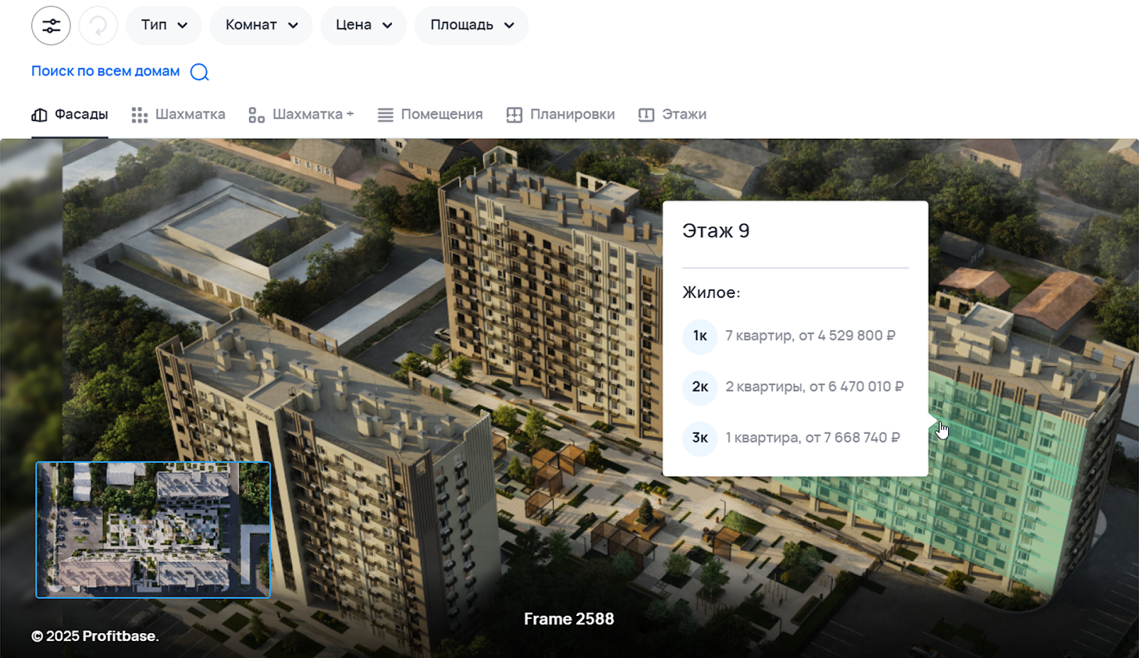 Сейчас клиент сразу видит всю информацию: от планировки до конечной стоимости с учётом скидок. Это важно, доля наших заявок с сайта — 50%. Сейчас я передаю отделу маркетинга шахматку, представляю площадь квартир, комнатность, стоимость квадратного метра и итоговую стоимость лота. Далее коллеги выгружают эту информацию в Смарт-каталог Profitbase, дополняют планировками и рендерами.