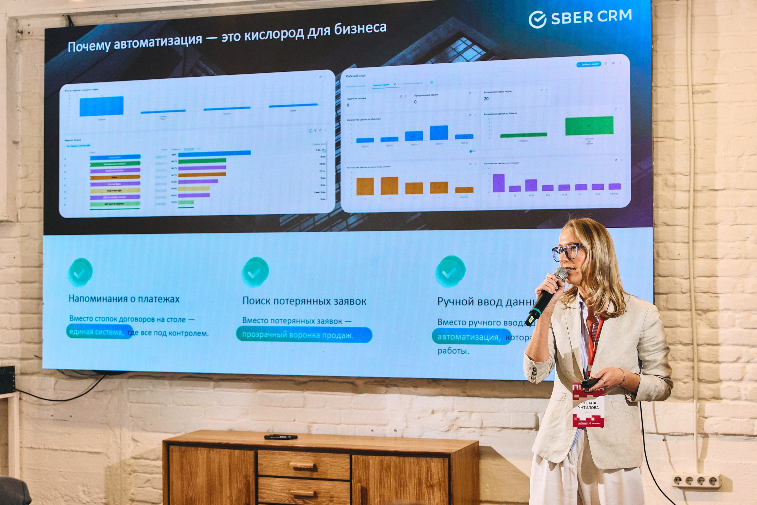 Директор проектов SberCRM Оксана Унтилова в своём выступлении объяснила, как автоматизация помогает застройщикам перевести все критически важные для бизнеса процессы из хаоса в понятную систему: