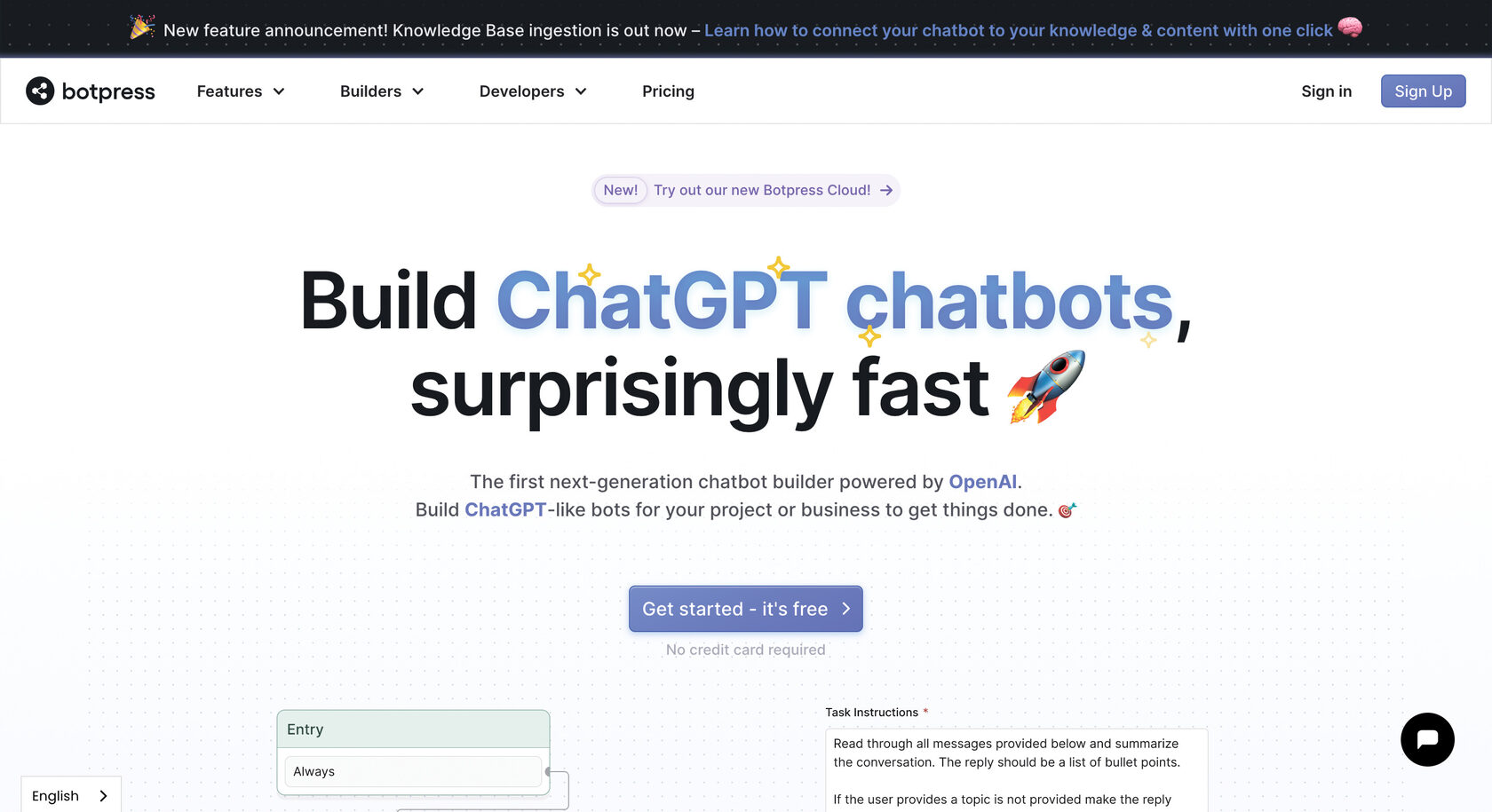 Botpress является открытым исходным кодом конструктора чат-ботов с расширенными возможностями для разработчиков. Он предоставляет гибкость и контроль, но требует технической экспертизы для установки и настройки.