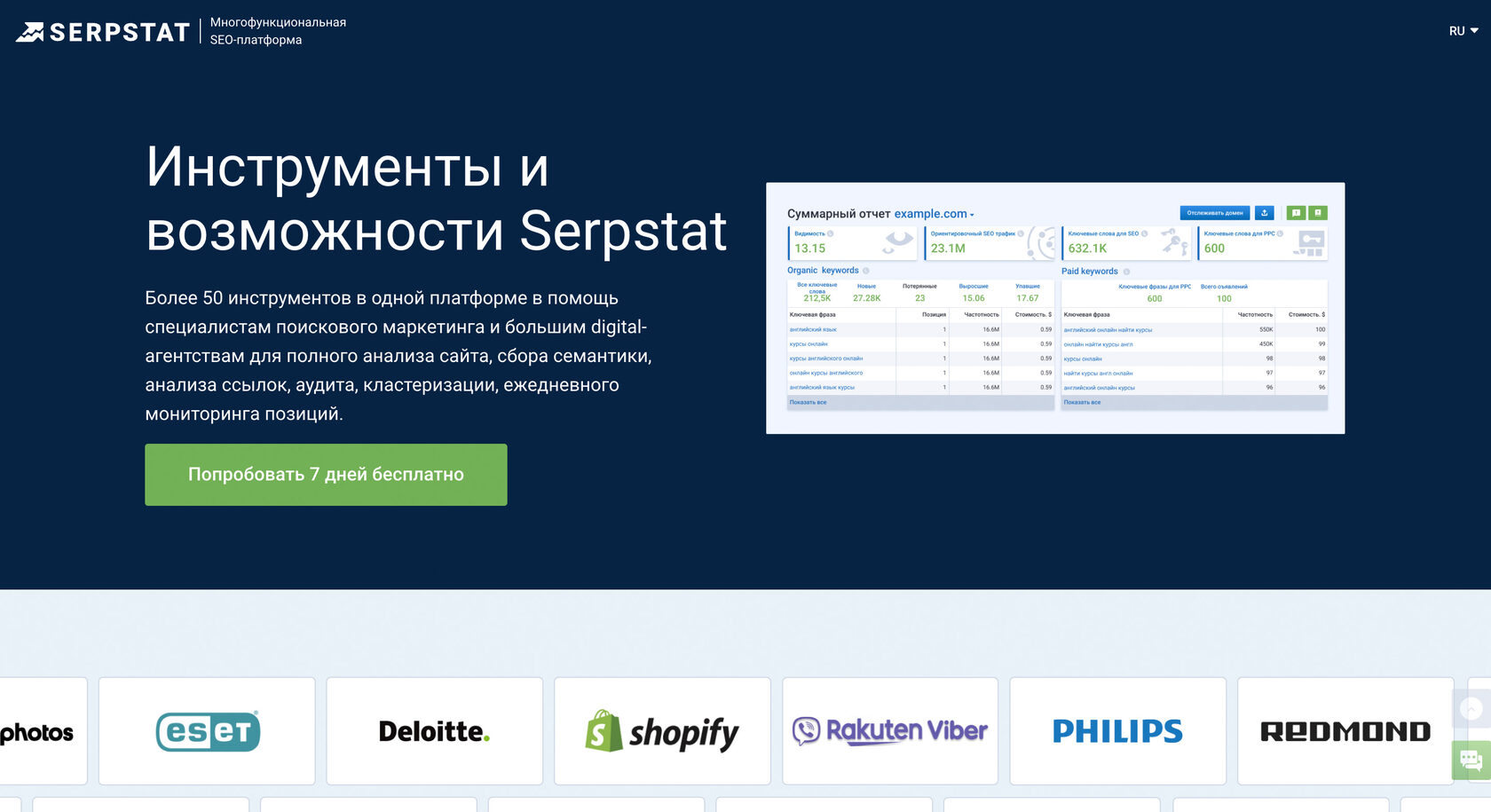 Serpstat — это комплексный сервис для анализа сайтов и ключевых слов. Он предоставляет инструменты для исследования ключевых слов, анализа позиций в поисковой выдаче, анализа обратных ссылок, анализа контента и других задач, связанных с SEO-оптимизацией. Serpstat позволяет найти новые ключевые слова, изучить конкурентов, мониторить изменения в позициях сайта и получить рекомендации по оптимизации.