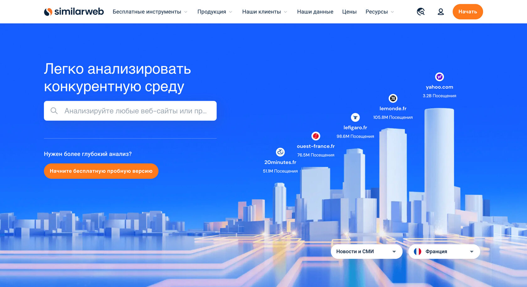SimilarWeb — это сервис, предоставляющий данные о трафике и поведении пользователей на веб-сайтах. Он позволяет анализировать трафик сайта, исследовать источники трафика, определять популярность сайтов и анализировать конкурентов. SimilarWeb также предоставляет информацию о ключевых словах, по которым сайт получает трафик, и помогает определить успешные стратегии продвижения.