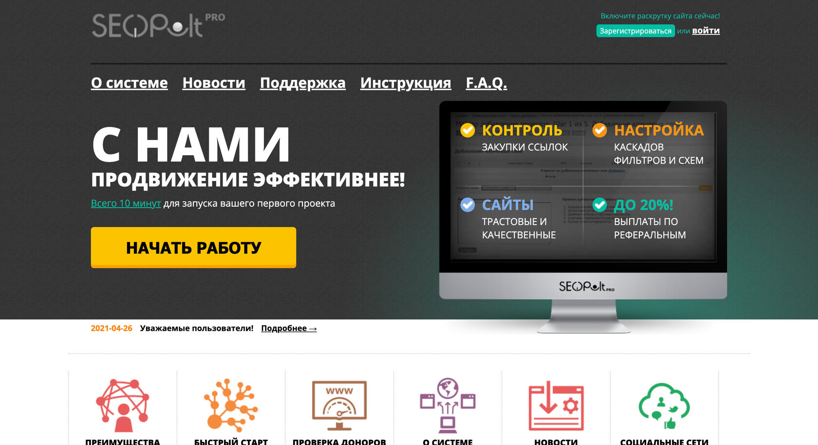 SeoPult — это комплексный сервис для автоматизации и управления продвижением сайтов. Он предоставляет инструменты для анализа ключевых слов, мониторинга позиций в поисковой выдаче, оптимизации контента и других аспектов SEO. SeoPult также предоставляет возможности для запуска и управления рекламными кампаниями, анализа конкурентов и улучшения показателей продвижения. Сервис позволяет эффективно управлять SEO-стратегиями и повысить видимость сайта в поисковых системах.