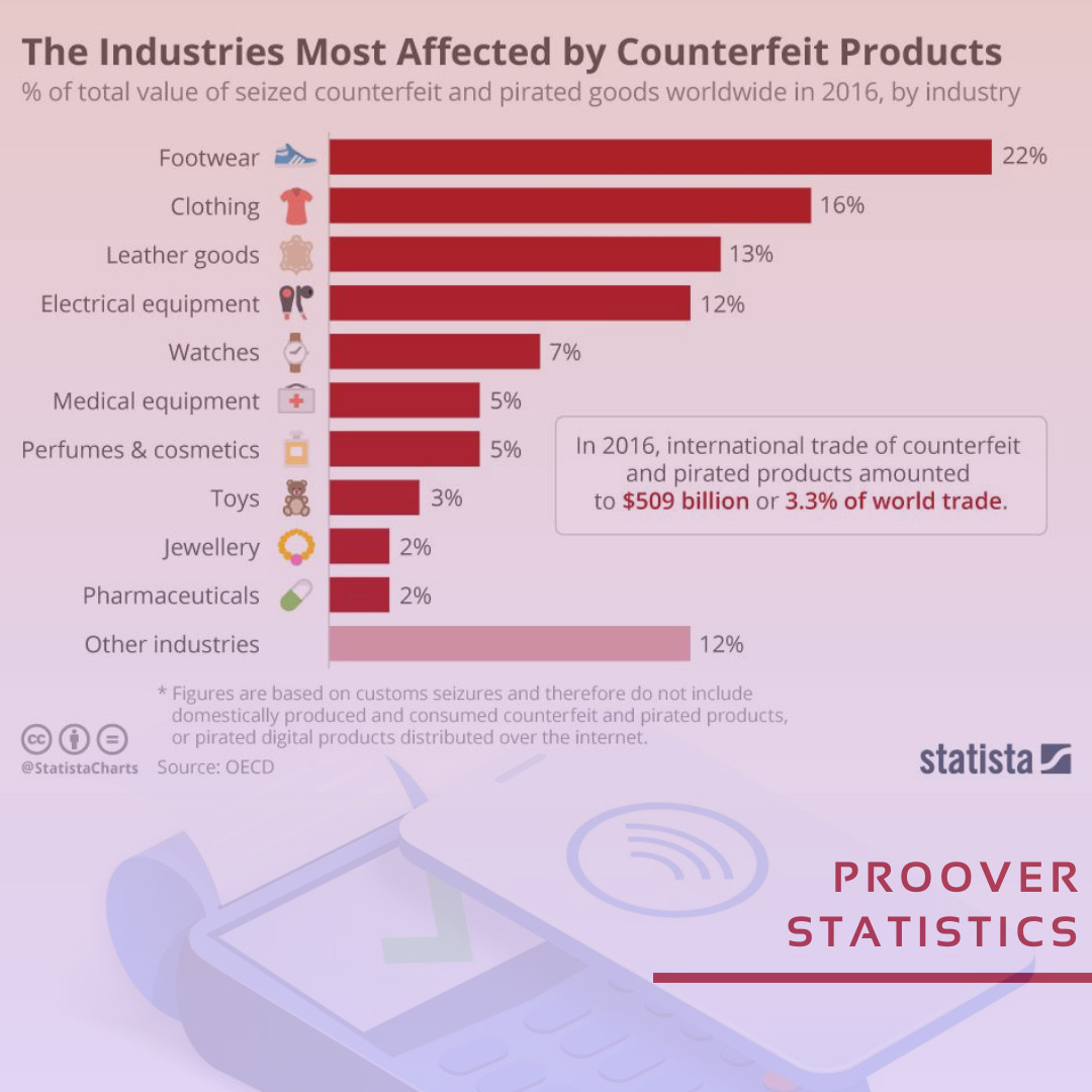 Трудно недооценить влияние контрафактной продукции на мировую экономику — по самым скромным подсчетам, объём российского рынка контрафактной продукции составляет 2,5 трлн рублей в год, мирового — 500 млрд долларов. В противовес словам российского эксперта выступает исследование от AP News — по словам аналитиков издания, мировой рынок контрафактной продукции уже сейчас составляет 1,82 трлн долларов. Это в 3 раза больше значений Поповичева, оценка которого лучше подходит для периода 2014-2016 года. По данным Forbes, в 2018 году производство и продажа контрафактной продукции стало самым прибыльным преступным бизнесом. Продажи контрафактной и пиратской продукции уже тогда составляли 1,7 триллионов долларов в год, что больше, чем рынок наркотиков и торговли людьми. Эксперты издания дали прогноз, что к 2022 году рынок подделок дорастет до 2,8 триллиона долларов и создаст 5,4 миллиона рабочих мест. Принимая во внимание вышепредставленную статистику, мы можем сделать вывод, что события развиваются согласно их сценарию. По оценке специалистов аналитического агентства Statista, больше всего от подделок страдают американские компании. Следом за ними недополучают прибыль компании из Франции, Италии, Швейцарии и Германии. Такие выводы были сделаны после анализа периода 2014-2016 года. По оценке экспертов International Anti-Counterfeiting Coalition, наибольшая доля подделок обнаружена в алкогольной и табачной продукции (более 40%), в одежде и обуви (около 35%), среди парфюмерии и косметики, а также в фармацевтических препаратах — (более 20%). Доля подделок в продовольственных товарах составляет примерно 10%, а в остальных исследованных категориях — 5% и менее. Данная статистика актуальна на 2020 год. В последний годы также участились случаи подделки электроники — самыми популярными товарами для злоумышленников стали смартфоны, компьютеры и планшеты. Наибольший урон по прибыли компаний наносят подделки обуви, одежды, кожаных изделий, электроники, часов, медицинских товаров, парфюмерии и косметики, игрушек, ювелирных изделий и фармакологических препаратов. Необходимо отметить, что производство и реализация подделок нарушает основные положения законодательства в области защиты Интеллектуальной Собственности, наносит материальный урон, бьет по репутации бренда, а также подрывают доверие потребителей. Сегодня компании тратят миллиарды долларов, в попытках защитить свой продукт от подделок. Однако актуальные на сегодняшний день методы защиты не способны обеспечить необходимую защиту: производители усложняют упаковку продукта, специальные подразделения компаний занимаются поиском в интернете фальсификата, чтобы заявить в суд о нарушении прав интеллектуальной собственности, дизайнеры брендов постоянно обновляют коллекции продукции и сопутствующих аксессуаров, технологи применяют различные виды маркировки, включая Bar-code и QR-code, которые дают ограниченную возможность использования онлайн идентификации. Слабая эффективность вышеперечисленных методов защиты обусловлена несколькими причинами: 1. В основном контрафакт производят нелегально партнеры-производители продукции, а также бывшие сотрудники компаний-брендов. Имея доступ к технологической информации, рынку сбыта, а также к информации на серверах компании, не составляет большого труда реализовать фальсификат без большо