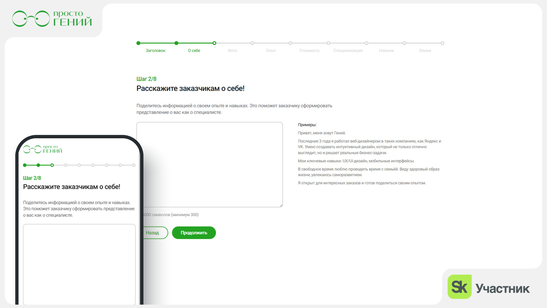 Самый простой способ — через Яндекс, VK или Mail.ru. Вам не нужно вводить пароль или помнить email — достаточно пары кликов. Это быстро, безопасно и удобно. Расскажите, что вы умеете делать лучше всего: профессию, опыт, навыки. Мы добавили подсказки, чтобы вы смогли оформить профиль за 3–5 минут. Советы: Поздравляем — ваш профиль создан! Теперь можно начать: Каждый день к нам присоединяются новые специалисты, готовые помочь в ваших проектах. Здесь появляются новые заказы каждый день — выбирайте, откликайтесь и начинайте зарабатывать. ✨ Создавайте, развивайтесь, пробуйте новое — и пусть это станет началом вашего профессионального пути вместе с «Просто Гений». Будьте среди первых, кто начнёт свою историю вместе с нами. Подписывайтесь на наши ресурсы: • Дзен • ВКонтакте •Telegram • Rutube • YouTube #ПростоГений #Фриланс #Удаленнаяработа #Онлайнзаказы #профиль #Сколково