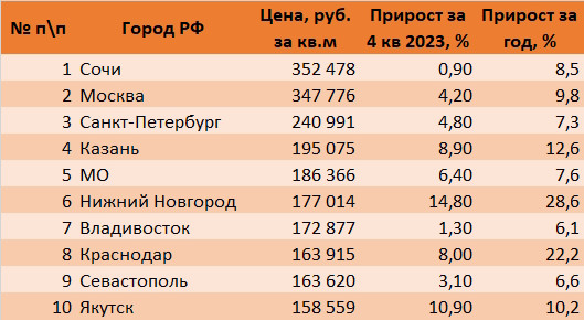 Анализируя динамику цен последнего квартала 2023 года, можно отметить, что стоимость квадратного метра выросла во всех крупных городах, кроме Грозного, где цены упали на 0,8%.