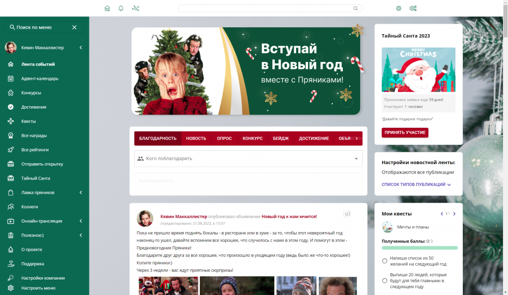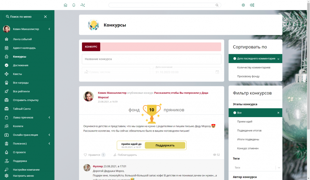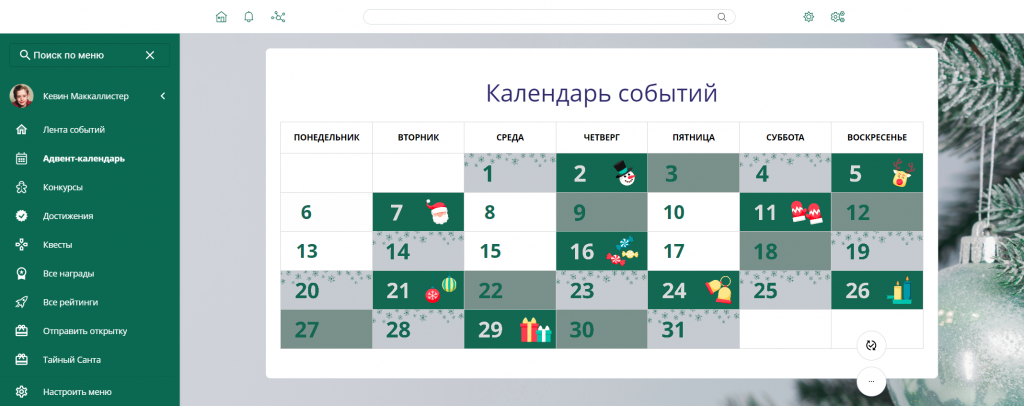 Представьте себе: у вас есть предновогодний месяц — декабрь, в котором каждый день наполнен Новогодними активностями для сотрудников: конкурсами, викторинами, благодарностями и подготовкой к празднику. И всё это проходит на онлайн-платформе, которая по-новогоднему забрендирована и оформлена в праздничных и ваших фирменных корпоративных цветах.