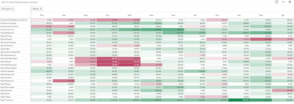 одной сети, а также внутри одного ресторана месяц к месяцу или год к году (LFL -