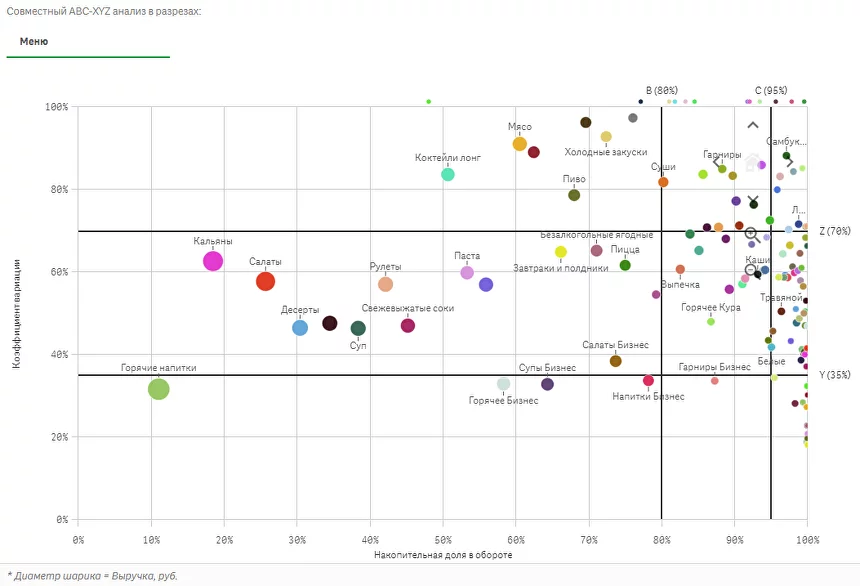 like-for-like сравнение). 2. Средний чек (Spend per head или Average check size) Сумма денег, потраченная клиентами за посещение, т. е. средний чек, является способом определения количества клиентов, необходимого для достижения точки безубыточности. Данные о среднем чеке показательны на фоне общего объема продаж. 3. Доход в разрезе позиций в меню Показатель демонстрирует, насколько востребованы те или иные блюда. Для более точного анализа хорошо знать маржинальность каждой позиции, поскольку можно опираться на разную бизнес-модель и продавать меньше блюд с высокой маржой или больше низкомаржинальных, и получить один и тот же финансовый итог. Выбор бизнес-модели зависит от концепции ресторана. 4. Доход на посадочное место в час (RevPASH) Чем выше значение этого KPI, тем больше ресторан зарабатывает на заданной вместимости. Отслеживание RevPASH помогает ресторанам оптимизировать рассадку, увеличить чек и улучшить общую заполняемость зала и доход. МАРКЕТИНГ 5. Количество гостей (Traffic или Guest Count) Этот показатель показывает, насколько заведение популярно у гостей. Его полезно отслеживать несколько в течение года в разбивке по часам, а также будням и выходным, чтобы знать пиковые периоды и прогнозировать выручку. Этот KPI измеряет средние продажи с каждого столика в ресторане. Это важный фактор для оптимизации пропускной способности ресторана. Оборачиваемость стола будет разной для заведений разного типа, например фастфуд-сети или ресторана с обслуживанием официантами. 7. Скорость обслуживания (MPT — minutes per transaction/SoS — Speed of Service) В условиях постоянного ускорения всех процессов клиенты также будут ожидать высокой скорости обслуживания. Этот показатель напрямую влияет на удовлетворенность и число повторных визитов. 8. Рейтинг блюд Этот показатель покажет позиции в меню, которые являются основными драйверами выручки. С точки зрения маркетинга к таким блюдам надо привлекать внимание и делать допродажи. Кроме того, показатель поможет найти аутсайдеров, к которым стоит применить акции или, возможно, исключить из меню. Для большей глубины можно дополнительно использовать ассортиментный ABC-XYZ-анализ. Модель ABC-анализа построена по принципу Парето, который предполагает, что 20% усилий дают 80% результата: например, какие 20% позиций меню дают 80% оборота. XYZ-анализ показывает стабильность спроса на те или иные позиции. На сайте Qlever Solutions доступен онлайн-сервис, который сделает ABC-XYZ-анализ и поможет увидеть главные драйверы в меню ресторана и позиции-аутсайдеры. 9. Эффективность маркетинговых акций (ROMI — Return on Marketing Investment) Данная метрика позволяет выявить рентабельность затрат на маркетинг и показывает, как маркетинговая активность влияет на выручку. Отслеживание этого показателя позволит выбирать только эффективные инструменты продвижения и не расходовать маркетинговый бюджет впустую. ДОСТАВКА 10. Заказов выполнено/заказов в работе Показывает эффективность работы и помогает проанализировать, достаточно ли сотрудников работает на кухне, чтобы заказы выполнялись вовремя. 11. Скорость доставки Время получения готового заказа клиентом оценивает эффективность работы службы доставки, оценивает достаточность персонала, а также помогает ресторатору выбрать оптимальную стратегию: самостоятельную доставку или через службы-агрегаторы. 12. Доля онлайн заказов в структуре продаж 