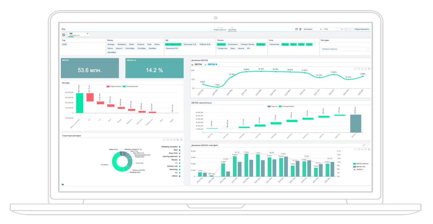 КАК СЧИТАТЬ Данные для расчета EBITDA берутся из бухгалтерской отчетности — отчета о прибыли и убытках. Компании обычно прогнозируют EBITDA на 12-месячный период, а отчитываются за прошедший 12-месячный период, но также показатель может считаться ежемесячно или ежеквартально. Обычно EBITDA считают на основе чистой прибыли: Показатель можно также считать от выручки: Учитываются расходы без вычета процентов, налогов, износа и амортизации. Для комплексной оценки EBITDA рассматривают в совокупности с дополнительными финансовыми показателями: Рентабельность по EBITDA (EBITDA Margin) — отражает эффективность бизнеса. Чем выше значение, тем лучше компания использует доступные ресурсы. Срок окупаемости по EBITDA (EV/EBITDA) показывает, как быстро окупится стоимость компании при текущем уровне прибыли, неизрасходованной на амортизацию и налоги. Долг по EBITDA (Debt/EBITDA) отражает уровень долговой нагрузки компании. Центробанк РФ считает закредитованными компании, у которых коэффициент Debt/EBITDA > 4. КАКОЙ РЕЗУЛЬТАТ ДОЛЖЕН ПОЛУЧИТЬСЯ Многие компании устанавливают целевые значения EBITDA и информируют о них сообщество инвесторов. Величина показателя зависит от отрасли и может сравниваться только со значениями показателей компаний из одного и того же сектора экономики. Положительное значение свидетельствует об успешности, и чем оно выше, тем лучше. ДЛЯ ЧЕГО СЧИТАТЬ EBITDA является мерой операционной прибыльности компании во времени, но исключающей искажающий эффект от изменений в политике взимания процентов, налогов, учета износа и амортизации. Показатель отражает общую успешность компании и позволяет сравнивать между собой компании и их операционную прибыль без учета разницы в системе налогообложения и структуре капитала. Также показатель может быть полезен при планировании внешнего финансирования, он отражает, хватит ли у бизнеса средств для покрытия платежей по обязательствам. Ключевые показатели эффективности (KPI) используются для понимания текущей ситуации в бизнесе: оценки успешных результатов и выявления областей, на которые следует обратить внимание. Грамотная оценка эффективности поможет совершенствовать продукты и услуги, получить новые конкурентные преимущества, своевременно выявлять тенденции и предсказывать события. Команда Qlever Solutions разработает дашборды для детального анализа ключевых KPI
