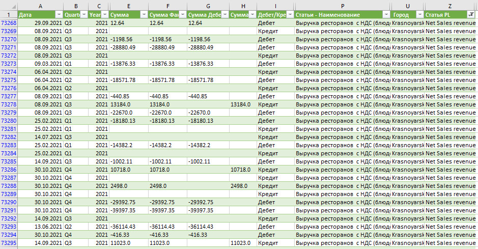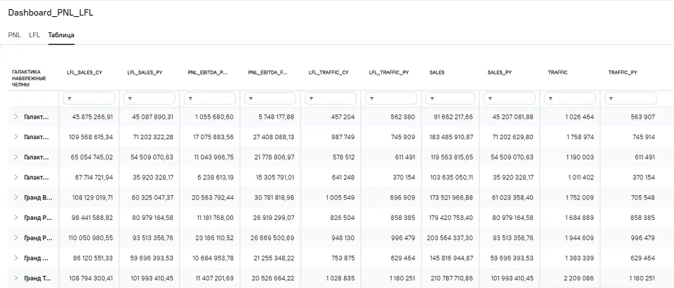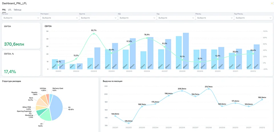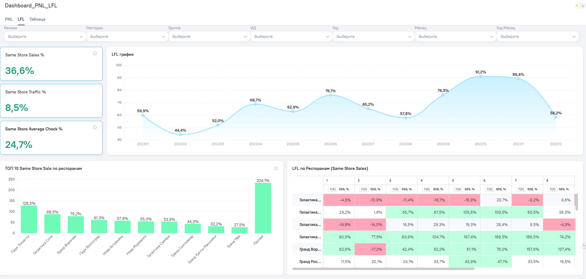 Вместо использования BI-решений, которые помогают автоматизировать аналитику, визуализировать данные и найти ценные новые ценные, большинство организаций продолжает использовать для отчетов сводные таблицы в Excel, мучительно сверять их вручную и получать некорректные результаты. Что лучше для аналитики: Excel или BI? Сравнение инструментов Низкое качество данных, недостаток анализа и давление сроков приводят к тому, что стратегические решения принимаются необдуманно, спонтанно и приводят к ошибкам. По опыту клиентов Qlever, около 20-35% всех данных в компании являются не актуальными и влияют на результаты итоговой статистики и принимаемые решения. Команда Qlever уже более 10 лет занимается внедрением корпоративных аналитических систем для крупных компаний в сфере ритейла, ресторанного бизнеса, производства, энергетики. Наши клиенты обращаются к нам с уникальными задачами, решение которых всегда лежит в работе с качеством данных и извлечении максимальной ценности из бизнес-информации. Ознакомьтесь с кейсами наших клиентов: Как автоматизация P&L отчетности помогла сэкономить до 1 млн.р./год Сотрудники крупной сети фастфуда вручную готовили PnL (Profit & Loss) отчетность для ресторанов, из-за чего управляющим на местах не всегда удавалось вовремя заметить точки падения показателей и предпринять меры. Автоматизация P&L-отчетности в BI помогла сети принимать управленческие решения на неделю раньше и сэкономила до 96 часов в месяц, что эквивалентно порядка 958 тысяч руб. затрат на оплату труда в год из расчета средней зарплаты финансового аналитика в Москве. Анализ доставки: как можно получать до 18–25 млн с помощью геоаналитики упущенных заказов Эксперты Qlever Solutions доработали delivery-приложение на базе BI для ресторанной сети, чтобы клиент мог оптимизировать зоны доставки, отслеживать причины упущенных заказов и ежемесячно брать в работу около 30–50 тысяч дополнительных заказов (18-25 млн руб). Как аналитика позволила контролировать товарные потери и снизить их до 3% Благодаря аналитике произошло снижение потерь до 3%, которое помогло сети супермаркетов приблизиться к достижению планов по маржинальной выручке. Объем потерь на уровне 3% от товарооборота является средним по отрасли FMСG. Другие проекты Qlever Solutions >> *** На онлайн-встрече BI-разработчик команды Qlever продемонстрировал наглядный пример того, как визуализация данных способствует более высокой скорости и точности принятия решений. Для этого рассмотрели аналитическое приложение, которое содержит визуализации двух часто используемых в фуд-ритейл отчетов: PNL и LFL. PnL (Profit and Loss) — отчет о доходах и расходах — один из ключевых отчетов о финансовой деятельности компании, который показывает ее операционную эффективность. Чаще всего на практике собирается вручную и представлен в виде большой сводной таблицы. Таблицу формируют в Excel или с помощью других инструментов, например, того же BI. Рассмотрите таблицы ниже. Удобно ли искать и анализировать представленную информацию? Автоматизация в BI позволяет представить те же самые данные с помощью визуализаций: графиков, диаграмм, интерактивных элементов. Правильно подобранные визуальные образы воспринимаются более однозначно, чем текст, что делает визуализации ключевыми для понимания и запоминания информации. Хорошая визуализация помогает сократить время по