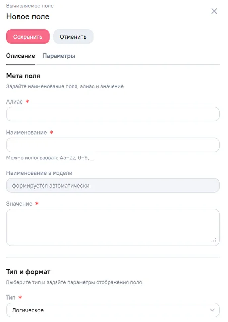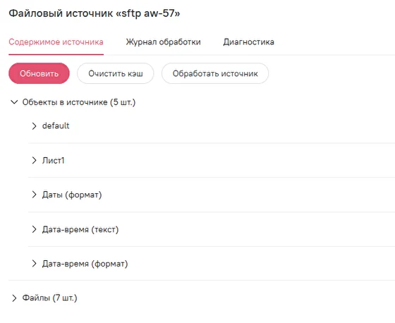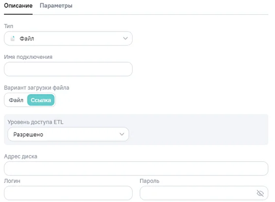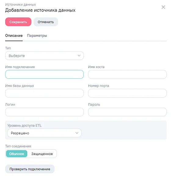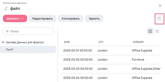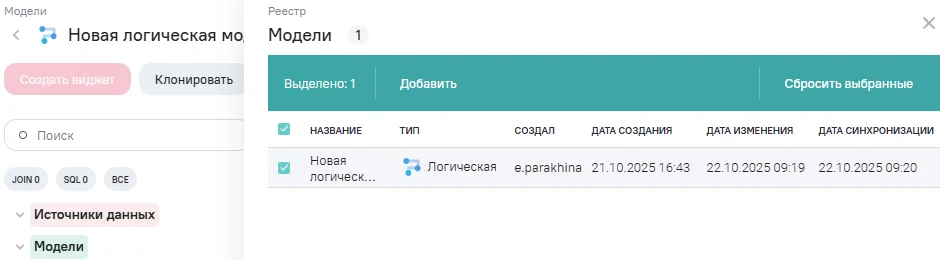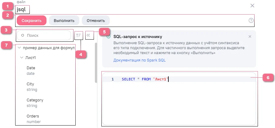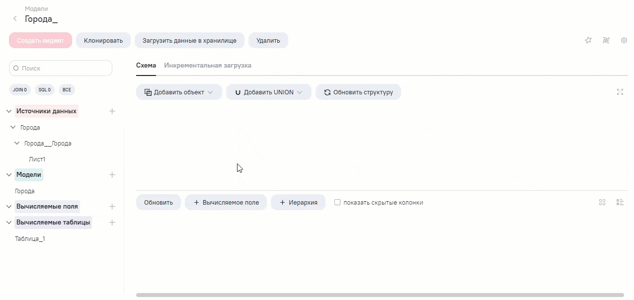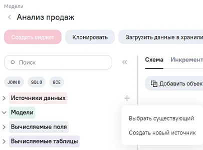 После авторизации открывается окно Системы. Главное меню содержит разделы (1): Для начала работы перейдите в раздел Источники данных. Чтобы добавить новый источник данных, нажмите кнопку «Добавить», откроется окно создания источника данных. В зависимости от выбранного типа источника поля интерфейса подключения могут меняться. При успешном подключении отобразится соответствующее сообщение об успехе. После создания источника можно посмотреть состав данных и описание столбцов в источнике, по двойному клику по источнику или через меню «...». При просмотре состава данных Система предлагает функциональность «Инспектор источника», чтобы: Инспектор открывается в отдельной вкладке браузера. Страница инспектора источника отличается в зависимости от типа источника: файлы, БД или 1С и OData. Для файлового источника Инспектор содержит вкладки: Через реестр объектов источников данных в главном меню можно редактировать, удалять или клонировать нужные вам источники данных, настраивать доступы по ролям, просматривать историю действий с источниками. Источники можно сгруппировать в Каталоги с целью облегчения поиска или разграничения прав доступа. Созданные источники данных можно добавить в новую и в существующую модель данных. Модель — табличные представления на основе выборки данных из подключенных источников, которые используются при построении виджетов и информационных панелей. В Системе модели делятся на два типа: Для работы с моделями нажмите на кнопку «Модель» в главном меню слева или в реестре источников данных установите флажок напротив источника данных и нажмите на кнопку «Добавить». В выпадающем списке выберите значение «Добавить в новую модель». В реестре моделей нажмите кнопку «Добавить» и выберите из выпадающего списка логическую или live-модель. Откроется окно редактирования новой модели. Для добавления источника данных нажмите на кнопку «+» в блоке Источники данных. Выберете необходимый вариант добавления: имеющийся или новый источник. Для добавления модели, как источника данных, нажмите на кнопку «+» в блоке Модели. В окне для выбора модели установите флажки напротив необходимых моделей и нажмите на кнопку Добавить. Для создания SQL запроса наведите курсор мыши на источник данных или модель. Нажмите на кнопку «...». В открывшемся меню выберите значение Добавить SQL. Откроется окно создания SQL запроса, в поле которого (6) можно создать сам запрос, задать наименование SQL-блока (1), управлять запросом с помощью кнопок (2) и т. д. SQL-запросы к файловым источникам выполняются через Spark SQL. В модели можно использовать вычисляемые таблицы — пользовательские блоки для обработки данных. Для добавления таблицы необходимо нажать кнопку «+» напротив блока Вычисляемые таблицы. С помощью контекстного меню «...» определить структуру таблицы, заполнить таблицу в ETL-редакторе. Для более сложного преобразования данных в таблицу можно добавить новый столбец, вычисляемый по математической формуле SQL-запросом — вычисляемое поле. Конструктор структуры данных позволяет: Добавление блоков выполняется с помощью перетаскивания drag-and-drop из левого меню окна на поле схемы модели. При создании модели по умолчанию отображаются данные основного первого блока данных. Дополнение столбцами из других связанных блоков производится с помощью связей блок
