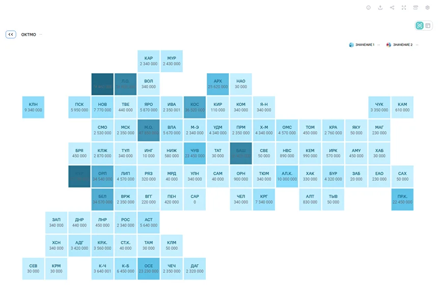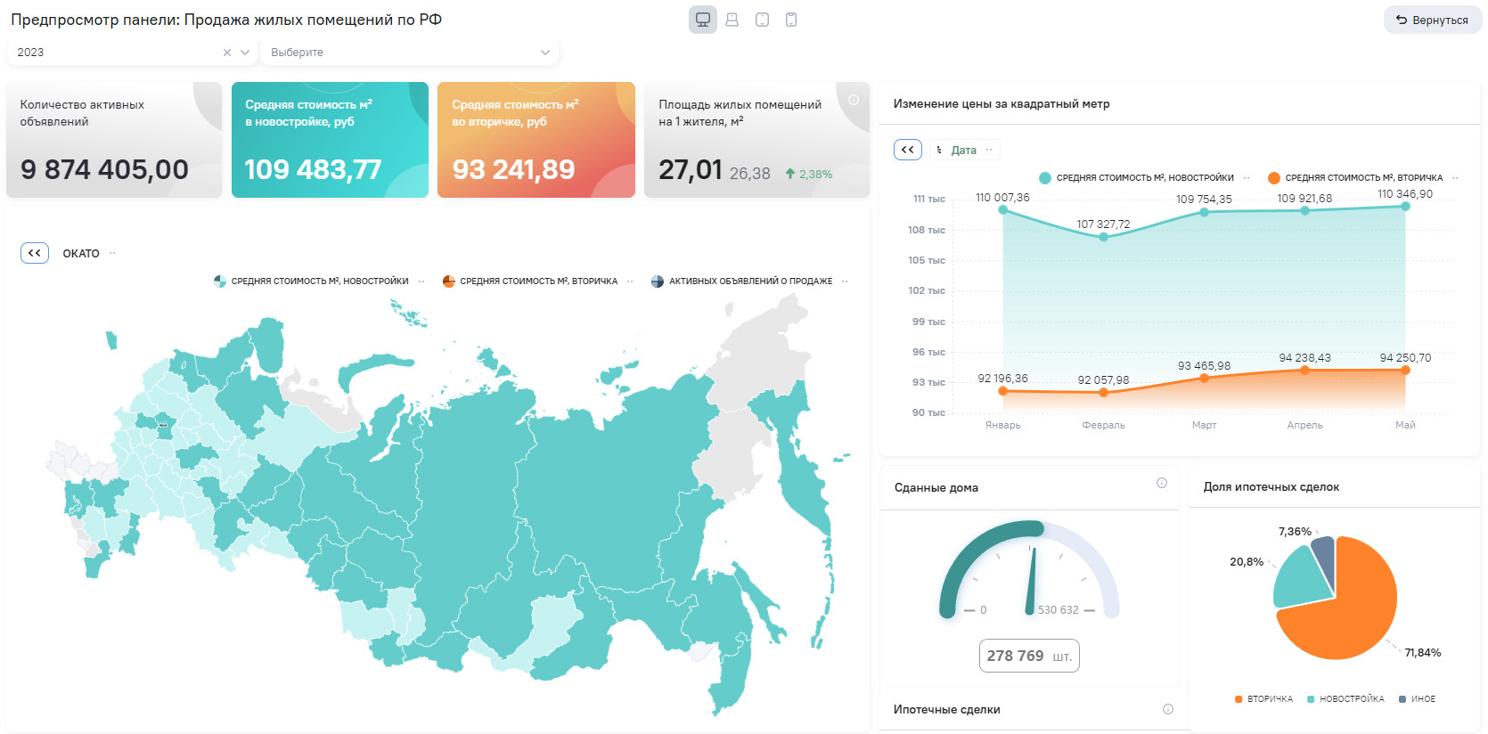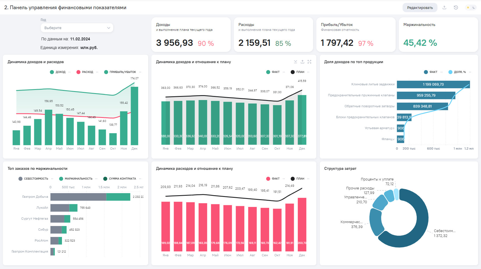 - Поддерживает адаптивную верстку дашбордов для 4 типов экранов, фильтрацию (базовую и расширенную, включая скрытые фильтры), сортировку и условное форматирование