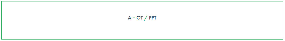 Доступность вычисляется как соотношение операционного времени и планируемого производственного времени Критерий производительности учитывает потери в скорости (SL), и рабочее время, оставшееся после учета потерь, называется чистым операционным временем (Net Operating Time, NOT). Вычисляется по формуле: NOT = OT — SL = PPT — DTL — SL Производительность (P) считается по формуле: