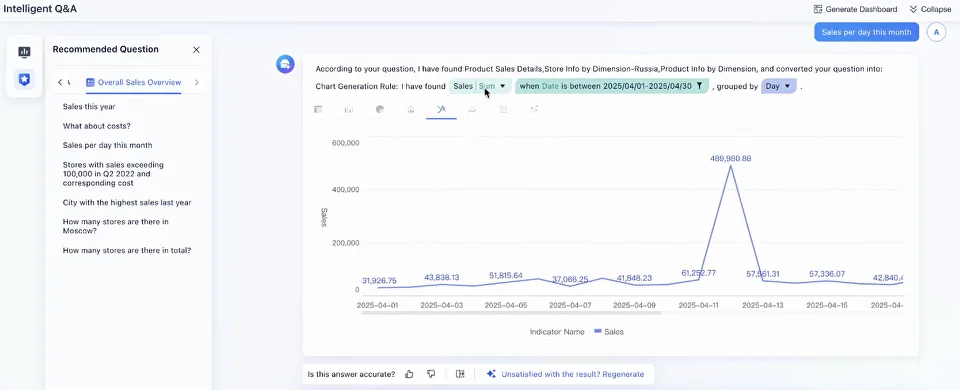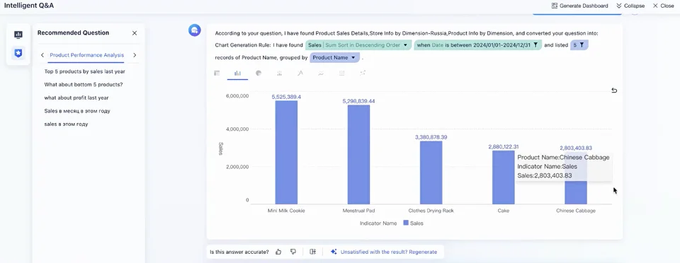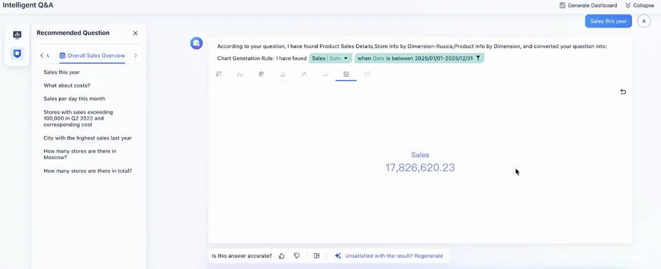 Ответы ChatBI основаны на надежных данных и предлагаются в понятном для пользователя виде — на естественном языке, в виде готовых диаграмм или таблиц, что позволяет: