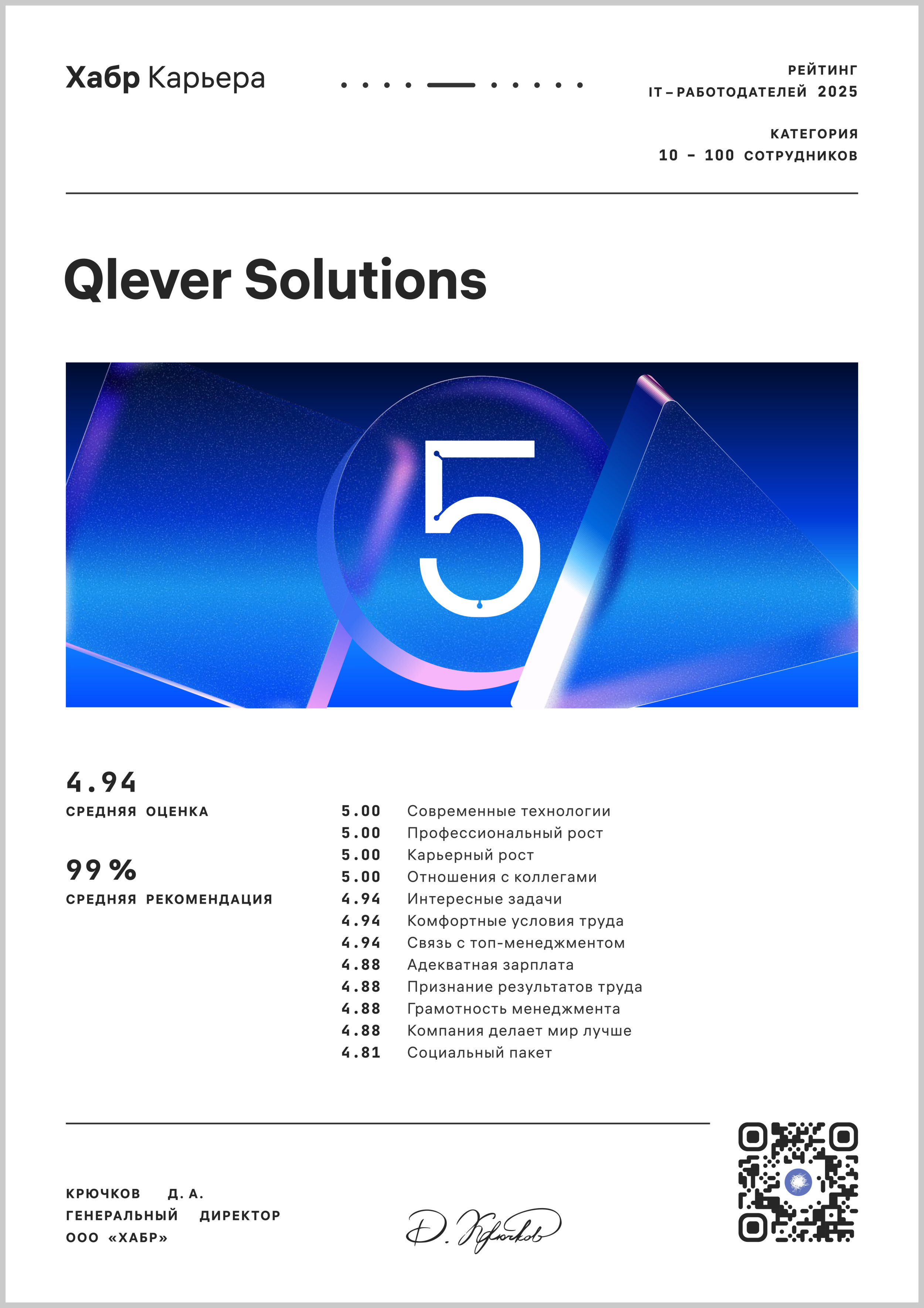 Команда Qlever Solutions — это фундамент роста и ключ к устойчивому развитию компании, поэтому особенно ценно видеть высокую оценку условий труда со стороны наших специалистов. Мы стараемся уделять особое внимание корпоративной среде и HR-бренду, создавая пространство, в котором можно раскрывать профессиональный потенциал, реализовывать карьерные амбиции и вместе разрабатывать ИТ-решения, действительно значимые для бизнеса.