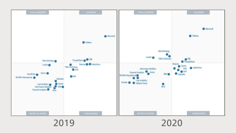 Лидеры в отчете Gartner в 2020 прежние. Это Microsoft, Qlik, Tableau и «темная лошадка» ThoughtSpot. Начиная с 2017 там ничего в общем-то не меняется.