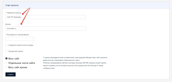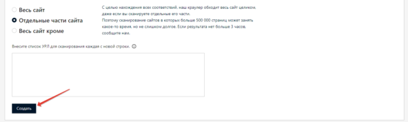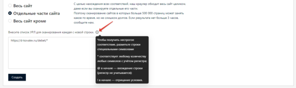 Чтобы начать работу, переходим на сайт to-scan.ru. По ссылке сразу откроется форма авторизации. Тут нажимаем «зарегистрироваться» и проходим стандартную регистрацию: имя, фамилия, е-мейл, пароль, подтвердить пароль. Останется подтвердить регистрацию по ссылке, которая придёт на почту, и можно заходить в аккаунт под своим логином и паролем. Вот так выглядит стартовая страница после авторизации. Чтобы создать новый проект, жмём соответствующую кнопку: Откроется страница нового проекта, где нужно указать его название и домен. Дальше настраиваем, как именно to scan будет анализировать сайт. В разделе «Регулярность» пока оставили оптимальную частоту — раз в день. Потом можно будет анализировать и чаще, но пока следим за нагрузкой, чтобы сильно не перегружать ни наш сервер, ни ваши сайты. Ниже выбираем область сканирования — весь сайт, отдельные части или всё, кроме отдельных ссылок. Если выбрали частичное сканирование, откроется окно, куда нужно вставить необходимые ссылки. Мы, как рекламное агентство, подключаем всем нашим клиентам полное сканирование, чтобы оперативно следить за всеми разделами. Выборочная проверка подходит, когда с сайтом работают 5-10 сеошников, и у каждого своя зона ответственности. Например, как было у нас с банком: один специалист оптимизирует раздел кредитов, другой — дебетовые карты и т.д. Если навести мышку на знак вопроса, появится подсказка о том, какие символы можно использовать для управления зонами сканирования: После этого останется нажать кнопку «Создать», и сразу запустится сканирование домена. Обратите внимание: даже если вы предложили сервису отсканировать маленький кусочек сайта, он всё равно обойдёт весь сайт, но покажет только те страницы, которые подходят под ваши требования. После запуска откроется окно с данными о домене. Вверху общая информация: возраст, сертификат SSL, метрики и пр. Ниже — битые ссылки, найденные карты сайта, файлы robots. Здесь же — дубли title, description, H1 и дубли, где H1 повторяет title. Самое важное находится во вкладке «Сканирование» в левом блоке меню. Здесь видим таблицу, где выписываются все url сайта по 50-100 штук на страницу. Если сайт большой, от 100 000 страниц, сканирование всех страничек может занять несколько часов. Рядом со ссылками отображается вообще всё, что смог найти краулер. Например, столбец «Прошлый ответ сервера» показывает данные предыдущего (вчерашнего) сканирования. Если вчера по какой-то из ссылок отображался код сервера 200, а сегодня 301, система пришлёт уведомление об этом. Тут же можно увидеть глубину, SSL, запрещена ли страница в Robots, meta robots и есть ли она в sitemap.xml. Если передвинуть табличку вправо, тут ещё больше информации: сколько исходящих ссылок, title, description по каждой странице, есть ли микроразметки Open Graph и Twitter, изменились ли они с прошлого сканирования. В самом конце — данные по заголовкам json, H1, H2, h3-h6, Canonical, вес страницы, есть ли отличия мобайла от десктопа. Если нужно найти что-то конкретное, в каждом столбце под названием есть строка поиска. Достаточно ввести ключевое слово, нажать enter, и система найдёт нужную страницу. Здесь же можно задать параметры поиска — по одному слову или нескольким. Если кликнуть по иконке в столбце «Посмотреть подробности», можно увидеть детальную информацию по конкретной странице. Тут 4 вкладки: общие сведения, заголовки, микроразметка, ссылк