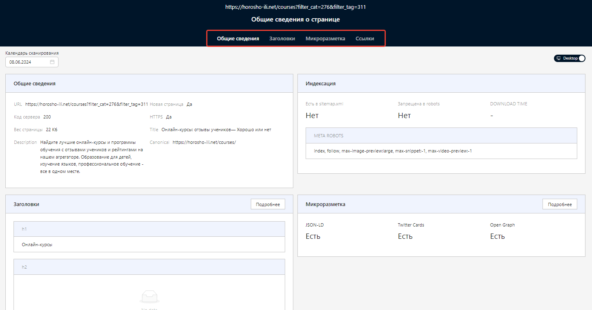 ● проводить полное или выборочное сканирование страниц на сайте по большому числу показателей;