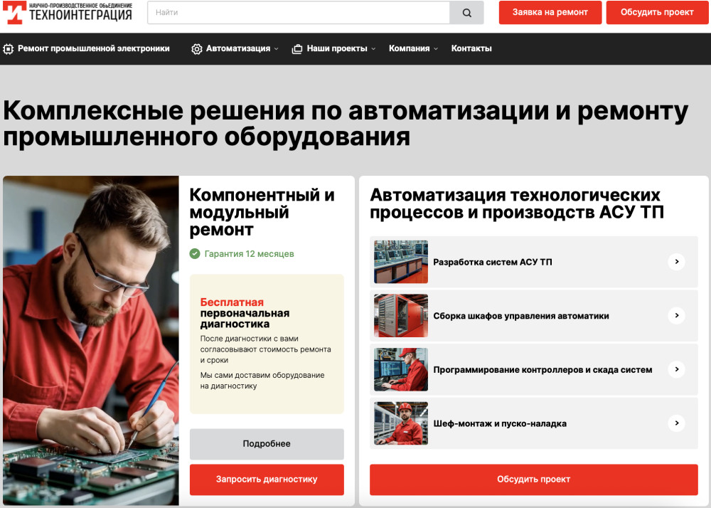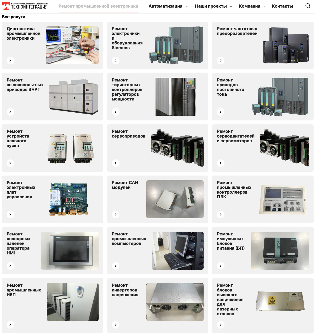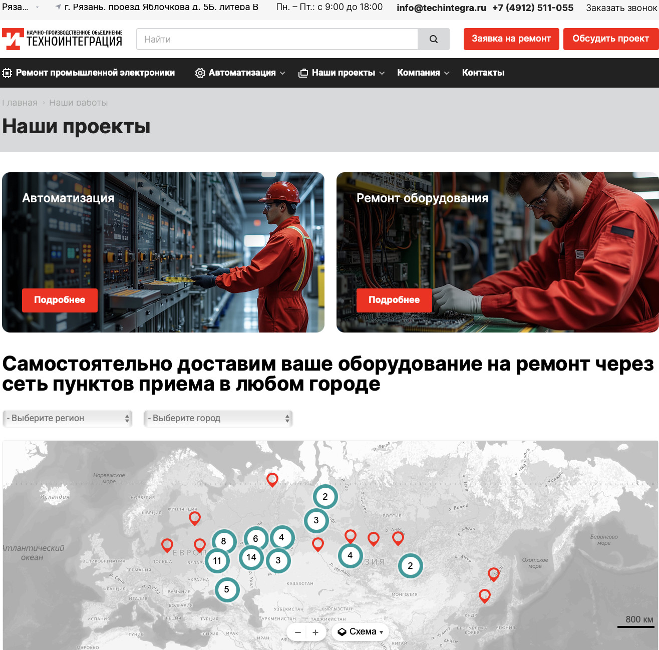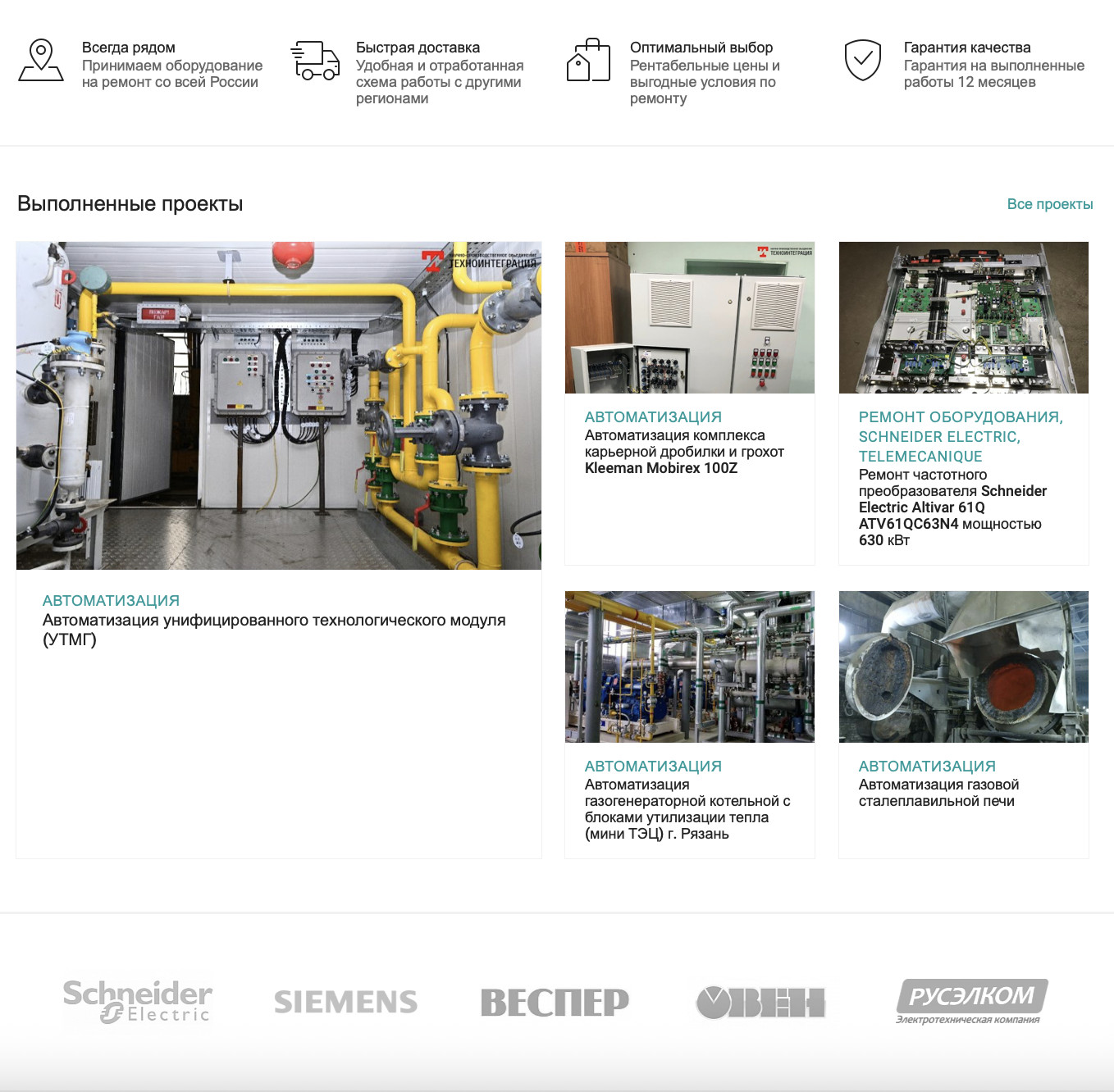 Для более наглядного сравнения продемонстрируем старый баннер, который был на главной странице сайта до нашей работы. На главную страницу мы вывели блоки с важной информацией, которую зачастую ищут клиенты. Мы намеренно сделали информацию легкодоступной, чтобы ее не нужно было искать по всем разделам сайта. Ведь как мы знаем, чем быстрее человек находит интересующую его информацию, тем лучше) Ознакомиться с услугами компании стало на порядок легче: текст удобно читать за счет однотонного фона, а изображения в едином стиле вызывают доверие и не отвлекают внимание от основной информации. Также мы добавили отдельный блок с крупными компаниями, доверяющими ТЕХНОИНТЕГРАЦИИ обслуживание своего оборудования. Данный блок положительно влияет на повышение лояльности к компании со стороны клиентов. Посетители сайта видят список из авторитетных компаний, благодаря чему принять решение о сотрудничестве с ТЕХНОИНТЕГРАЦИЕЙ становится легче. Ранее на главной странице был подобный блок, однако он был малозаметен, из-за чего не привлекал внимание посетителей сайта. Блок с подробной информацией о компании мы добавили внизу главной страницы. Здесь была размещена информация об услугах компании, а также о задачах, выполняемых специалистами ТЕХНОИНТЕГРАЦИИ. Кроме того, мы внедрили возможность прикреплять файлы в формы обратной связи. Благодаря наличию данной функции клиенты ТЕХНОИНТЕГРАЦИИ имеют возможность сразу отправить все необходимые для обсуждения своего проекта файлы и получить качественную обратную связь специалистов. Также на главной странице сайта мы разместили блок условий работы с компанией нашего клиента. Все пункты можно развернуть и ознакомиться с подробными условиями по каждому вопросу Теперь полную информацию об услугах компании можно найти в отдельном разделе. Четкая структура, отдельные блоки, наличие визуальных изображений — всё это способствует более легкому восприятию информации: людям легче находить интересующие их услуги, знакомиться с ними и оставлять заявки. В разделе «ремонта промышленной электроники и оборудования» мы разместили баннер и сделали доступной всю важную информацию: стоимость диагностики, срок ремонта, гарантия. Также мы оформили меню со всеми предоставляемыми услугами в удобном наглядном формате. К названию услуги в текстовом формате мы рядом прикрепили изображения, способствующие лучшему визуальному восприятию информации. На страницах услуг мыразместили не только подробное описание, но и примеры уже выполненных работ, что способствует повышению лояльности и доверия посетителей сайта Ранее блок с выполненными проектами был размещен прямо на главной странице сайта. Однако у потенциальных клиентов могли возникнуть сложности с тем, чтобы соотнести каждый выполненный проект к определенной услуге. Благодаря новой структуре сайта мы избавили посетителей от необходимости выполнять подобный поиск. Сейчас достаточно перейти в интересующую услугу и там же познакомиться с конкретными выполненными проектами. В разделе «наши проекты» посетители сайта могут легко ознакомиться с примерами ранее выполненных работ по каждому направлению: автоматизация или ремонт оборудования Кроме того, мы в RANX разработали удобный функционал поиска по ранее выполненным проектам. Посетители сайта м