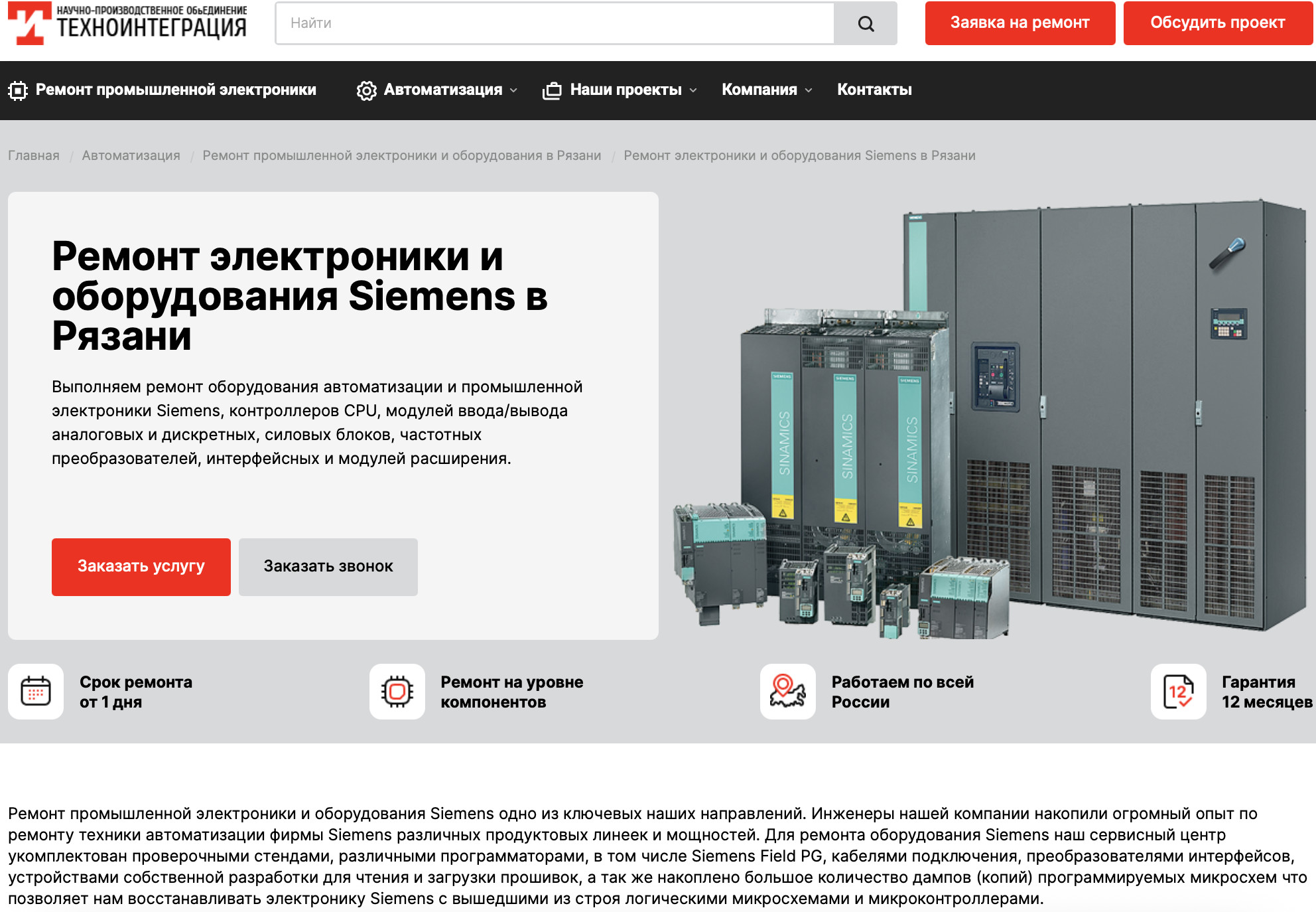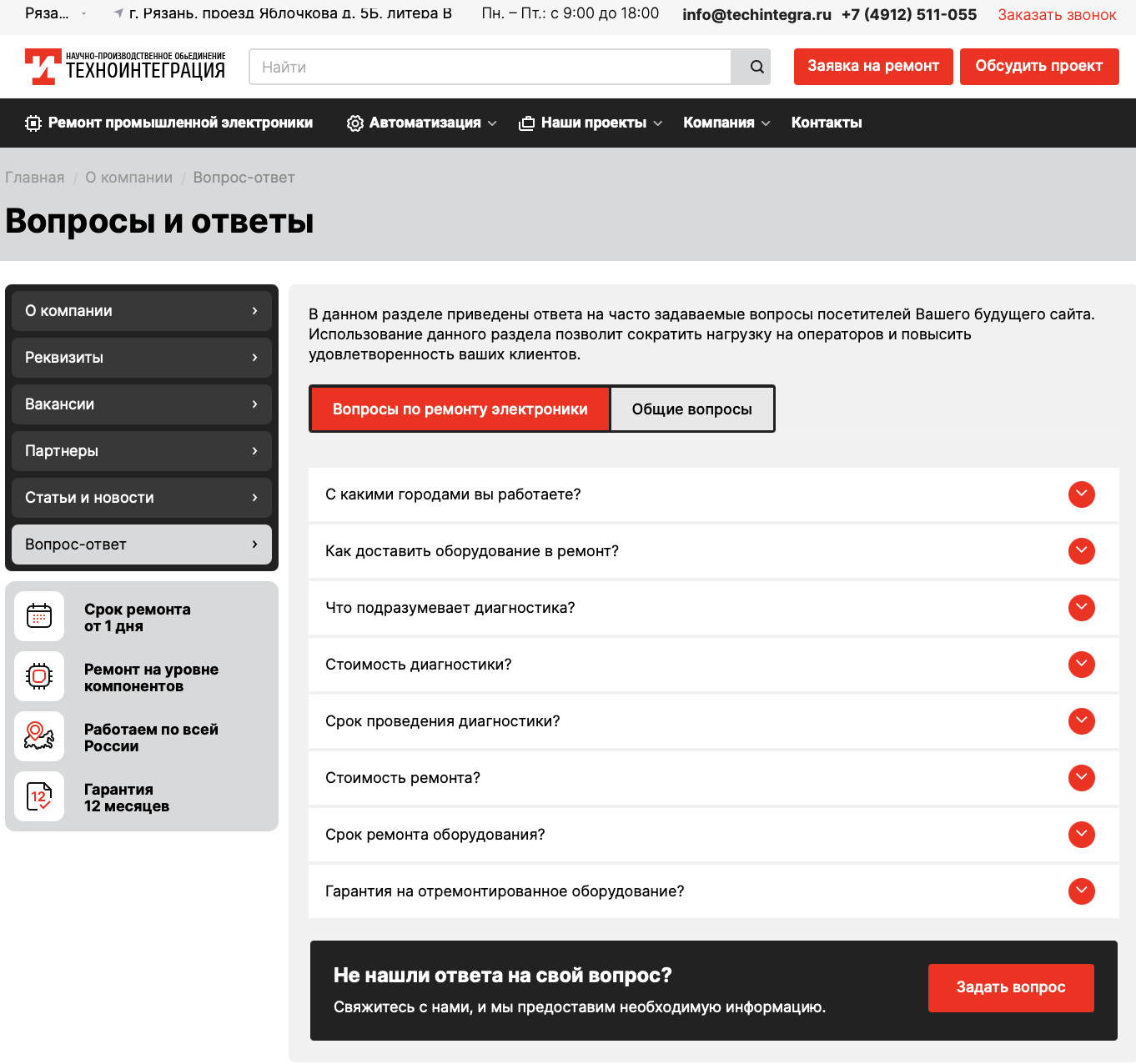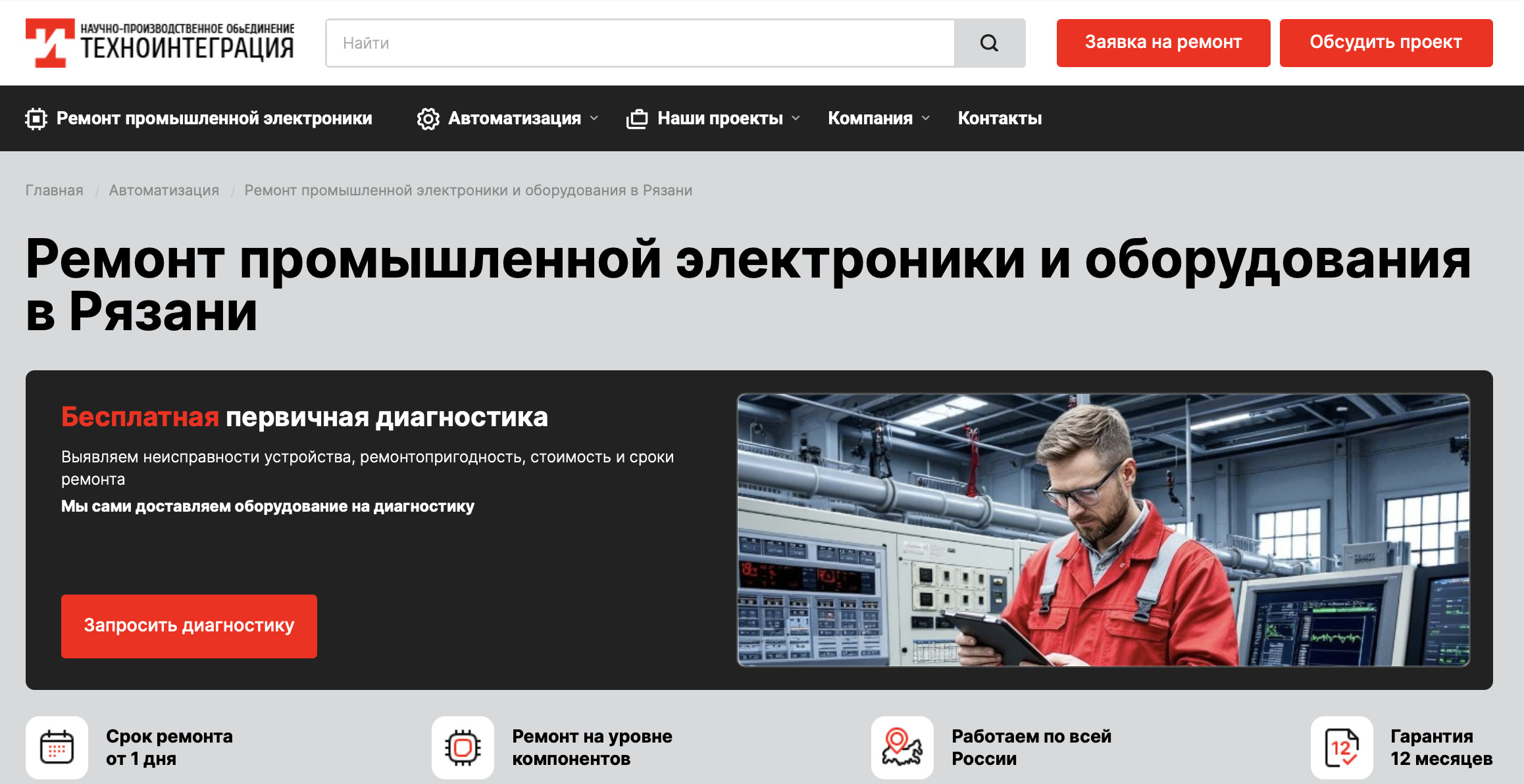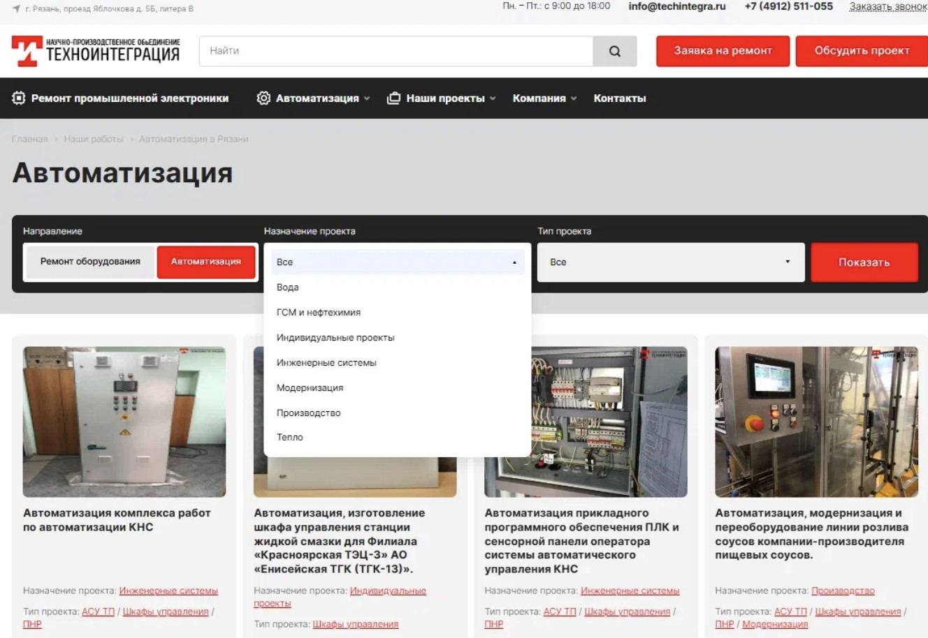 Для более наглядного сравнения продемонстрируем старый баннер, который был на главной странице сайта до нашей работы. На главную страницу мы вывели блоки с важной информацией, которую зачастую ищут клиенты. Мы намеренно сделали информацию легкодоступной, чтобы ее не нужно было искать по всем разделам сайта. Ведь как мы знаем, чем быстрее человек находит интересующую его информацию, тем лучше) Ознакомиться с услугами компании стало на порядок легче: текст удобно читать за счет однотонного фона, а изображения в едином стиле вызывают доверие и не отвлекают внимание от основной информации. Также мы добавили отдельный блок с крупными компаниями, доверяющими ТЕХНОИНТЕГРАЦИИ обслуживание своего оборудования. Данный блок положительно влияет на повышение лояльности к компании со стороны клиентов. Посетители сайта видят список из авторитетных компаний, благодаря чему принять решение о сотрудничестве с ТЕХНОИНТЕГРАЦИЕЙ становится легче. Ранее на главной странице был подобный блок, однако он был малозаметен, из-за чего не привлекал внимание посетителей сайта. Блок с подробной информацией о компании мы добавили внизу главной страницы. Здесь была размещена информация об услугах компании, а также о задачах, выполняемых специалистами ТЕХНОИНТЕГРАЦИИ. Кроме того, мы внедрили возможность прикреплять файлы в формы обратной связи. Благодаря наличию данной функции клиенты ТЕХНОИНТЕГРАЦИИ имеют возможность сразу отправить все необходимые для обсуждения своего проекта файлы и получить качественную обратную связь специалистов. Также на главной странице сайта мы разместили блок условий работы с компанией нашего клиента. Все пункты можно развернуть и ознакомиться с подробными условиями по каждому вопросу Теперь полную информацию об услугах компании можно найти в отдельном разделе. Четкая структура, отдельные блоки, наличие визуальных изображений — всё это способствует более легкому восприятию информации: людям легче находить интересующие их услуги, знакомиться с ними и оставлять заявки. В разделе «ремонта промышленной электроники и оборудования» мы разместили баннер и сделали доступной всю важную информацию: стоимость диагностики, срок ремонта, гарантия. Также мы оформили меню со всеми предоставляемыми услугами в удобном наглядном формате. К названию услуги в текстовом формате мы рядом прикрепили изображения, способствующие лучшему визуальному восприятию информации. На страницах услуг мыразместили не только подробное описание, но и примеры уже выполненных работ, что способствует повышению лояльности и доверия посетителей сайта Ранее блок с выполненными проектами был размещен прямо на главной странице сайта. Однако у потенциальных клиентов могли возникнуть сложности с тем, чтобы соотнести каждый выполненный проект к определенной услуге. Благодаря новой структуре сайта мы избавили посетителей от необходимости выполнять подобный поиск. Сейчас достаточно перейти в интересующую услугу и там же познакомиться с конкретными выполненными проектами. В разделе «наши проекты» посетители сайта могут легко ознакомиться с примерами ранее выполненных работ по каждому направлению: автоматизация или ремонт оборудования Кроме того, мы в RANX разработали удобный функционал поиска по ранее выполненным проектам. Посетители сайта м