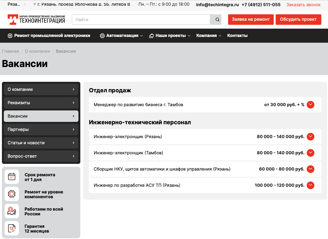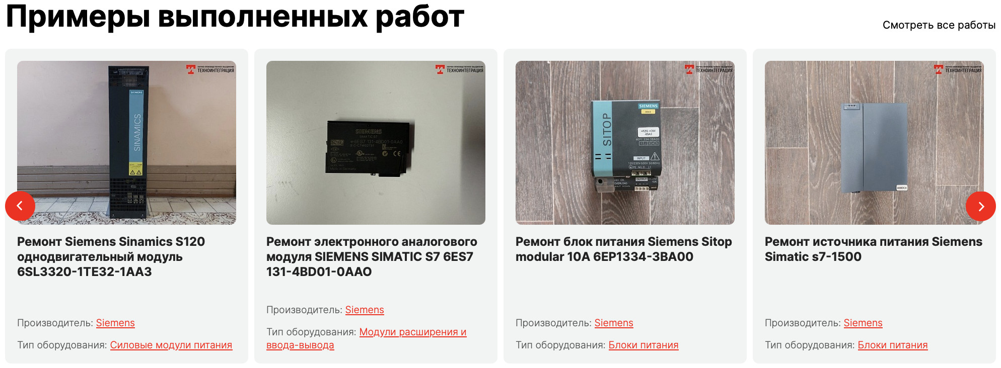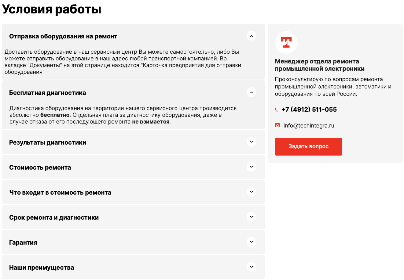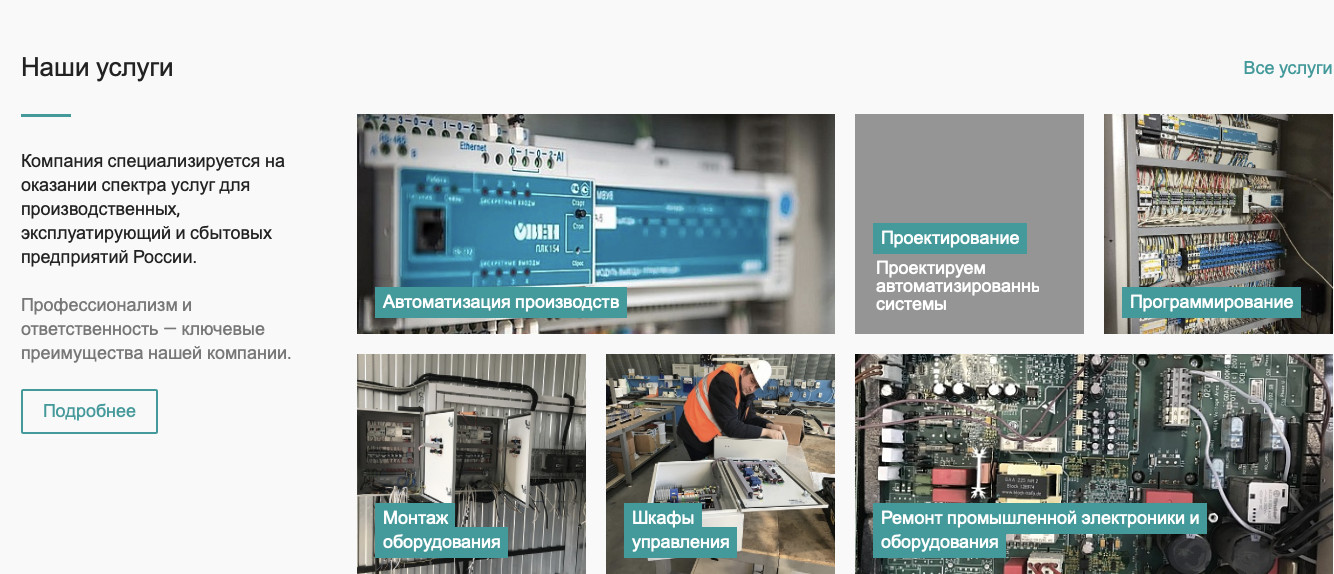 Для более наглядного сравнения продемонстрируем старый баннер, который был на главной странице сайта до нашей работы. На главную страницу мы вывели блоки с важной информацией, которую зачастую ищут клиенты. Мы намеренно сделали информацию легкодоступной, чтобы ее не нужно было искать по всем разделам сайта. Ведь как мы знаем, чем быстрее человек находит интересующую его информацию, тем лучше) Ознакомиться с услугами компании стало на порядок легче: текст удобно читать за счет однотонного фона, а изображения в едином стиле вызывают доверие и не отвлекают внимание от основной информации. Также мы добавили отдельный блок с крупными компаниями, доверяющими ТЕХНОИНТЕГРАЦИИ обслуживание своего оборудования. Данный блок положительно влияет на повышение лояльности к компании со стороны клиентов. Посетители сайта видят список из авторитетных компаний, благодаря чему принять решение о сотрудничестве с ТЕХНОИНТЕГРАЦИЕЙ становится легче. Ранее на главной странице был подобный блок, однако он был малозаметен, из-за чего не привлекал внимание посетителей сайта. Блок с подробной информацией о компании мы добавили внизу главной страницы. Здесь была размещена информация об услугах компании, а также о задачах, выполняемых специалистами ТЕХНОИНТЕГРАЦИИ. Кроме того, мы внедрили возможность прикреплять файлы в формы обратной связи. Благодаря наличию данной функции клиенты ТЕХНОИНТЕГРАЦИИ имеют возможность сразу отправить все необходимые для обсуждения своего проекта файлы и получить качественную обратную связь специалистов. Также на главной странице сайта мы разместили блок условий работы с компанией нашего клиента. Все пункты можно развернуть и ознакомиться с подробными условиями по каждому вопросу Теперь полную информацию об услугах компании можно найти в отдельном разделе. Четкая структура, отдельные блоки, наличие визуальных изображений — всё это способствует более легкому восприятию информации: людям легче находить интересующие их услуги, знакомиться с ними и оставлять заявки. В разделе «ремонта промышленной электроники и оборудования» мы разместили баннер и сделали доступной всю важную информацию: стоимость диагностики, срок ремонта, гарантия. Также мы оформили меню со всеми предоставляемыми услугами в удобном наглядном формате. К названию услуги в текстовом формате мы рядом прикрепили изображения, способствующие лучшему визуальному восприятию информации. На страницах услуг мыразместили не только подробное описание, но и примеры уже выполненных работ, что способствует повышению лояльности и доверия посетителей сайта Ранее блок с выполненными проектами был размещен прямо на главной странице сайта. Однако у потенциальных клиентов могли возникнуть сложности с тем, чтобы соотнести каждый выполненный проект к определенной услуге. Благодаря новой структуре сайта мы избавили посетителей от необходимости выполнять подобный поиск. Сейчас достаточно перейти в интересующую услугу и там же познакомиться с конкретными выполненными проектами. В разделе «наши проекты» посетители сайта могут легко ознакомиться с примерами ранее выполненных работ по каждому направлению: автоматизация или ремонт оборудования Кроме того, мы в RANX разработали удобный функционал поиска по ранее выполненным проектам. Посетители сайта м