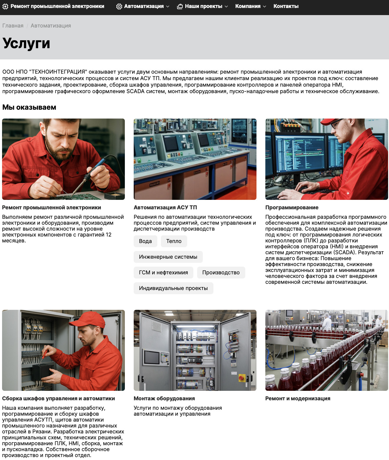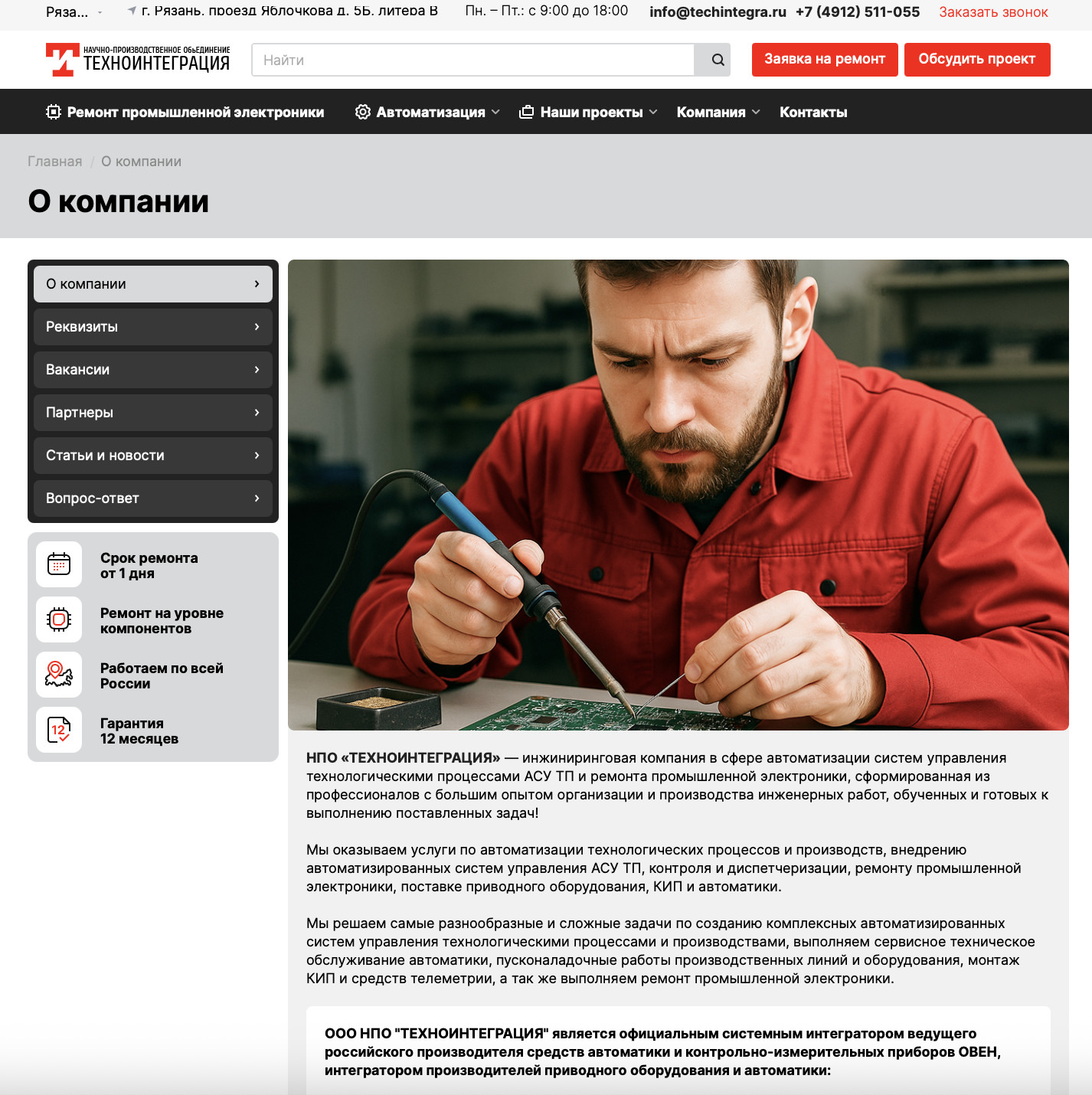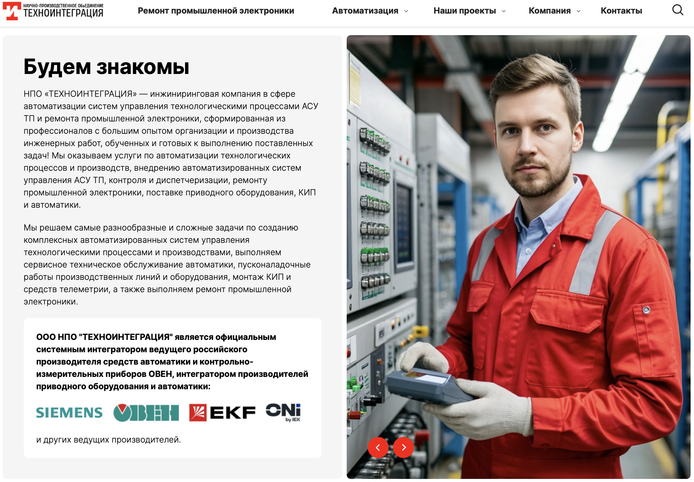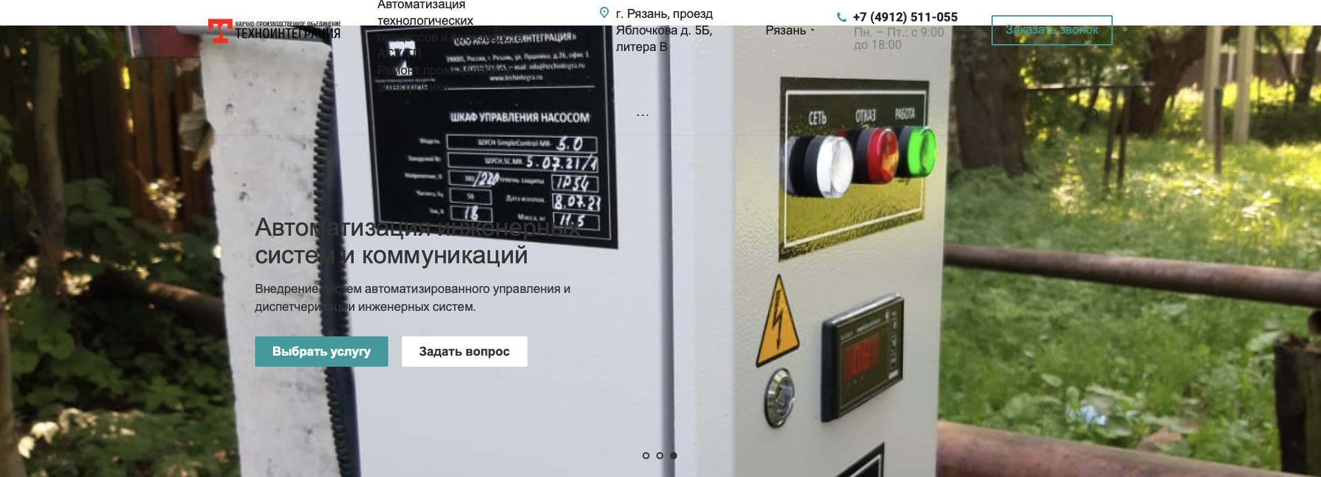 Нашим клиентом является компания ТЕХНОИТЕГРАЦИЯ, которая специализируется на производстве промышленной электроники и автоматизации технологических процессов. Клиент хотел получить современный, удобный и информативный сайт, который будет приносить заявки на электронную почту.