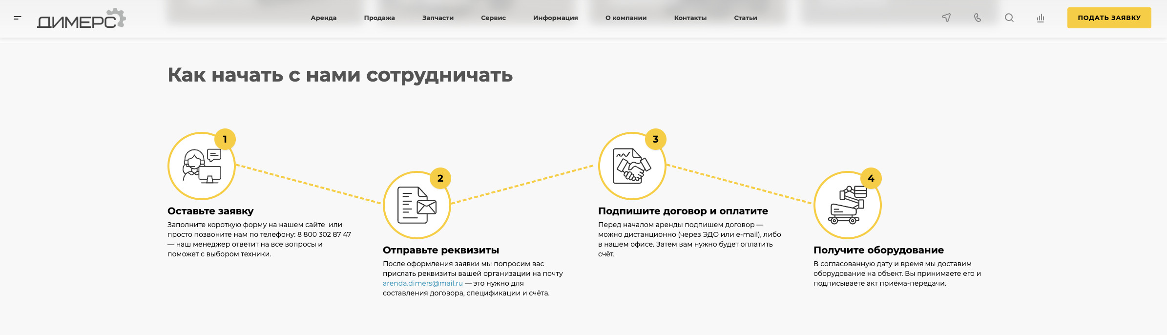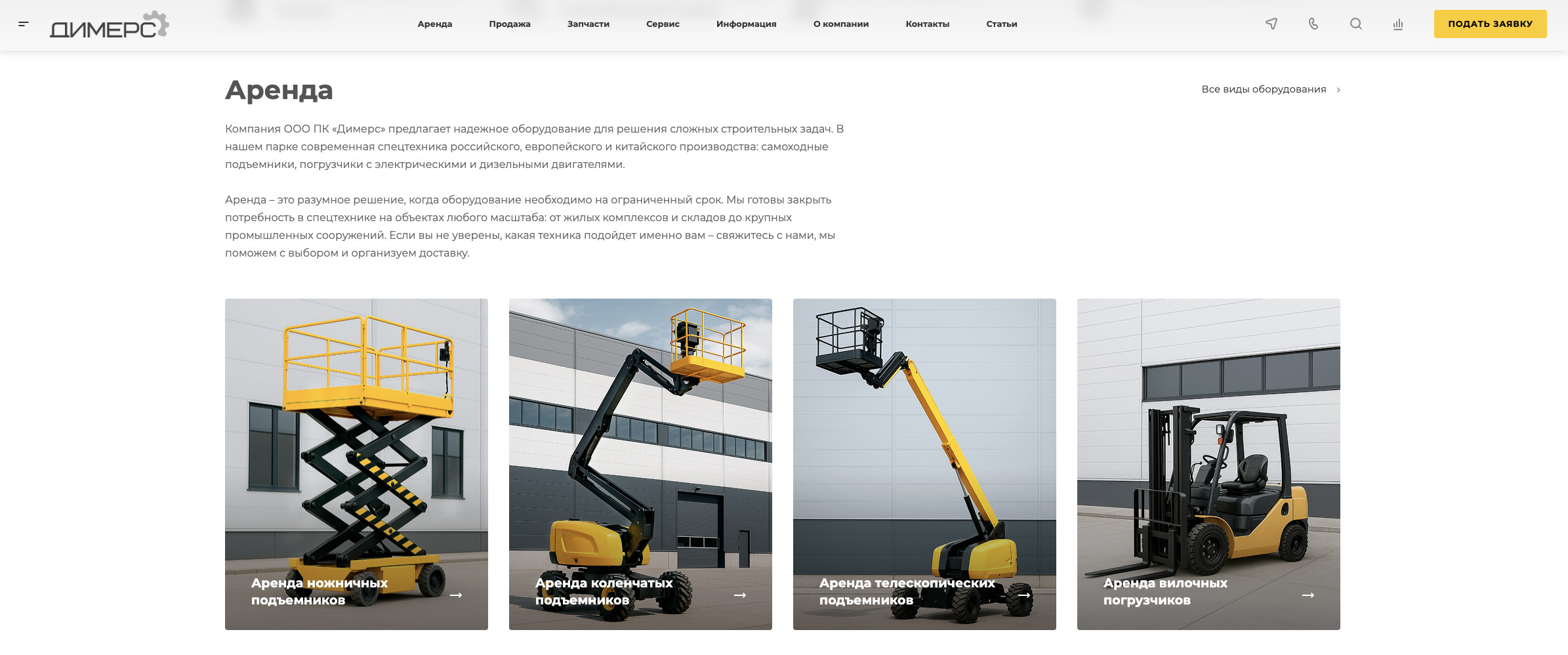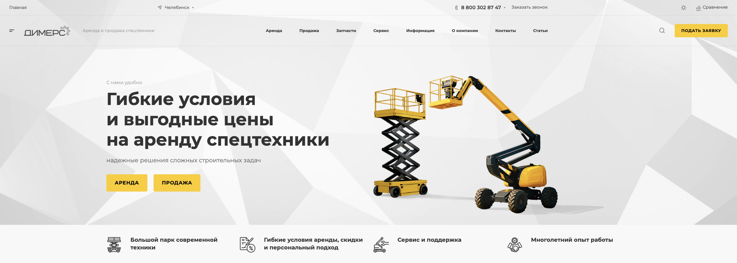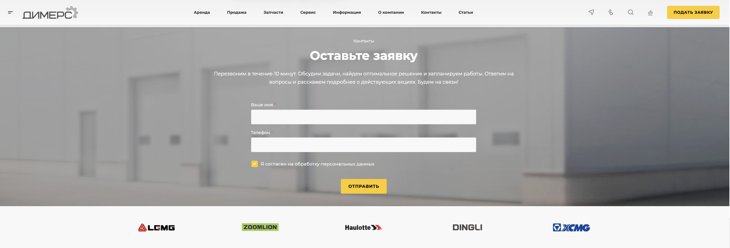 Для клиента важно было, чтобы на сайте была возможность удобно и быстро оформить заявку на аренду или связаться по вопросу покупки техники.